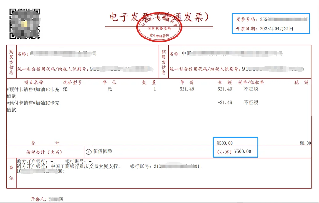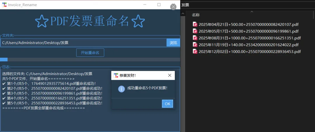 # -*- coding: utf-8 -*-"""@Time : 2025/12/13 9:10@Author : Driver_Won@微信公众号: Python与手工"""import reimport threadingimport pdfplumberimport ttkbootstrap as ttkfrom ttkbootstrap.constants import *from ttkbootstrap.dialogs import Messageboxfrom tkinter.filedialog import askdirectoryfrom pathlib import Pathclass GUI: def __init__(self, master): """Invoice_Rename GUI""" self.root = master self.invoice_pdf_dir = ttk.StringVar() # 生成一个StringVar对象,来保存发票文件夹路径 self.converting = False self.create_page() def create_page(self): """创建页面元素""" # 主控件 self.mf = ttk.Frame(self.root) self.mf.pack() # 标题标签 ttk.Label(self.mf, text='\U00002b50PDF发票重命名\U00002b50', font=('宋体', 30), bootstyle=PRIMARY).pack(pady=20) # 文件夹选择 lf1 = ttk.LabelFrame(self.mf, text="文件夹:", bootstyle=PRIMARY) lf1.pack(pady=2) ttk.Entry(lf1, width=74, textvariable=self.invoice_pdf_dir, bootstyle=PRIMARY).pack(side=LEFT, pady=2) self.b1 = ttk.Button(lf1, text='浏览', command=self.select_path, bootstyle=PRIMARY) self.b1.pack(side=RIGHT, pady=2) # 开始按钮 self.bt_start = ttk.Button(self.mf, text='开始重命名', width=10, command=self.start, bootstyle='outline-toolbutton') self.bt_start.pack(pady=2) # 进度条 self.pb = ttk.Progressbar(self.mf, length=740, mode=INDETERMINATE, bootstyle=PRIMARY) self.pb.pack(pady=2) # 日志显示 lf2 = ttk.LabelFrame(self.mf, text="日志:", bootstyle=PRIMARY) lf2.pack(pady=10) self.text = ttk.Text(lf2, wrap=ttk.WORD, height=12) self.text.config(state=DISABLED) # 默认text文本框不可编辑 self.text.pack(fill="both") def select_path(self): """ 选择文件夹按钮对应的事件,打开文件夹选择对话框 :return: """ path_pdf_dir = askdirectory(title='选择文件夹', ) # 文件选择对话框 if path_pdf_dir: # 选择了文件夹 self.invoice_pdf_dir.set(path_pdf_dir) self.insert_text(f'选择的文件夹: {path_pdf_dir}') def insert_text(self, text): """ 向文本框中插入文字 :return: """ self.text.config(state=NORMAL) self.text.insert(ttk.END, text) self.text.insert(ttk.END, "\n") self.text.see(ttk.END) # 设置文本框内容超出显示范围时自动滚动到底部 self.text.config(state=DISABLED) # self.text.update() def rename_invoice_pdf(self): """ PDF发票重命名 :return: """ target_dir = Path(self.invoice_pdf_dir.get()) if not self.invoice_pdf_dir.get() == '' else False if not target_dir or not target_dir.is_dir(): self.root.after(0, lambda: Messagebox.show_error(message='请先选择发票PDF文件夹!', title='出错啦!')) self.stop() return # 只处理文件夹下pdf文件 pdf_files = [f for f in target_dir.iterdir() if f.suffix == '.pdf'] pdf_num = len(pdf_files) renamed_num = 0 self.insert_text(f"共{pdf_num}个PDF文件,开始重命名========>>") # 开始提取信息 for i, pdf_path in enumerate(pdf_files): try: with pdfplumber.open(pdf_path) as f: page = f.pages[0] text = page.extract_text() # 开票日期 match_rq = re.search(r"开票日期[::]\s*(\d{4}年\d{2}月\d{2}日)", text) rq = match_rq.group(1).strip() if match_rq else f'未获取到日期{renamed_num+1}' # 金额 match_je = re.findall(r"[¥¥]\s*(\d+\.\d+)", text) je = match_je[-1] if match_je else f'未获取到金额{renamed_num+1}' # 发票号码 match_hm = re.search(r"发票号码[::]\s*(\w+)", text, re.IGNORECASE) hm = match_hm.group(1).strip() if match_hm else f'未获取到号码{renamed_num+1}' new_pdf_name = f"{rq}+{je}+{hm}.pdf" new_pdf_path = pdf_path.with_name(new_pdf_name) pdf_path.rename(new_pdf_path) renamed_num += 1 self.insert_text(f'✔ 第{i + 1}个/共{pdf_num}个,{pdf_path.name}重命名成功!') except Exception as e: self.insert_text(f'✘ 第{i + 1}个/共{pdf_num}个,{pdf_path.name}重命名失败! {e}') self.insert_text('========PDF发票全部重命名完成========\n') self.stop() self.root.after(0, lambda: Messagebox.show_info(message=f'成功重命名{pdf_num}个PDF发票!', title='恭喜发财!')) def start(self): """ 开始 :return: """ if self.converting: return self.converting = True self.bt_start.config(state=DISABLED) self.pb.start(12) threading.Thread(target=self.rename_invoice_pdf, daemon=True).start() def stop(self): """ 停止 :return: """ self.pb.stop() self.bt_start.config(state=NORMAL) self.converting = Falseif __name__ == "__main__": root = ttk.Window( title="Invoice_Rename", # 窗口标题 themename="superhero" # 主题 ) root.place_window_center() GUI(root) # 展示GUI界面 root.mainloop() # 进入消息循环(必需)
