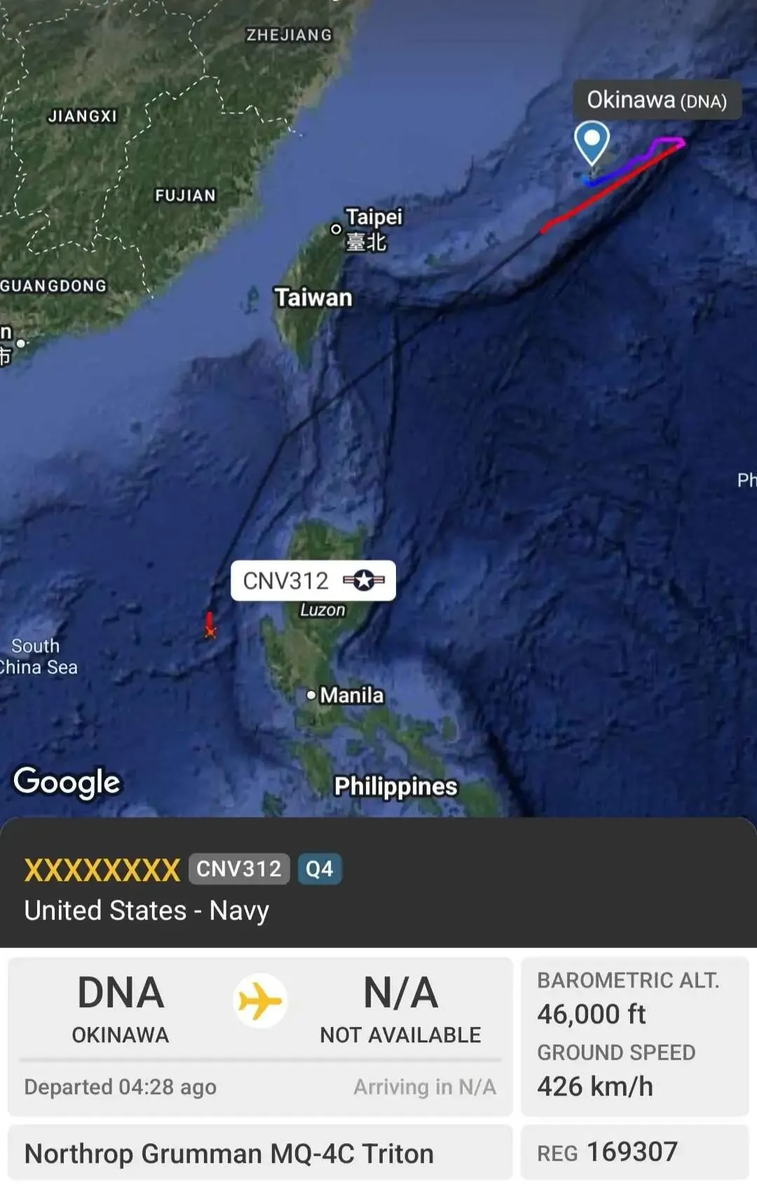 一架 Q4 全球鹰无人机从巴士海峡进入南海,抵达黄某岛上空盘旋