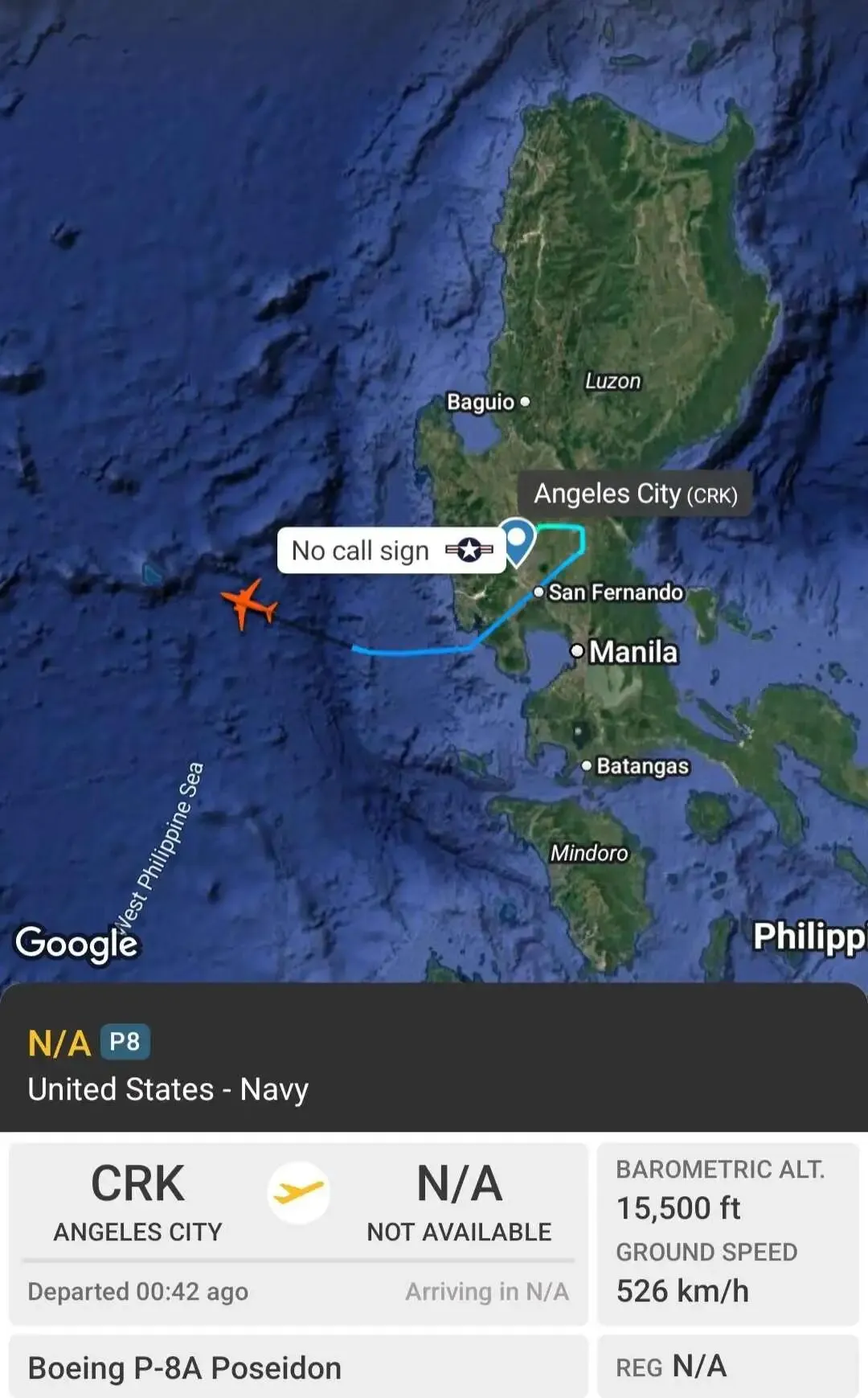 一架 P8 反潜姬从吕宋岛出发窜扰黄某岛