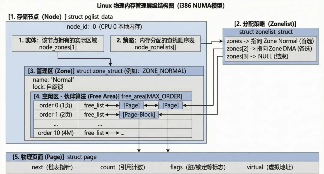 - 2. zonelist_struct (分配策略):前台的“客房安排规则表”。