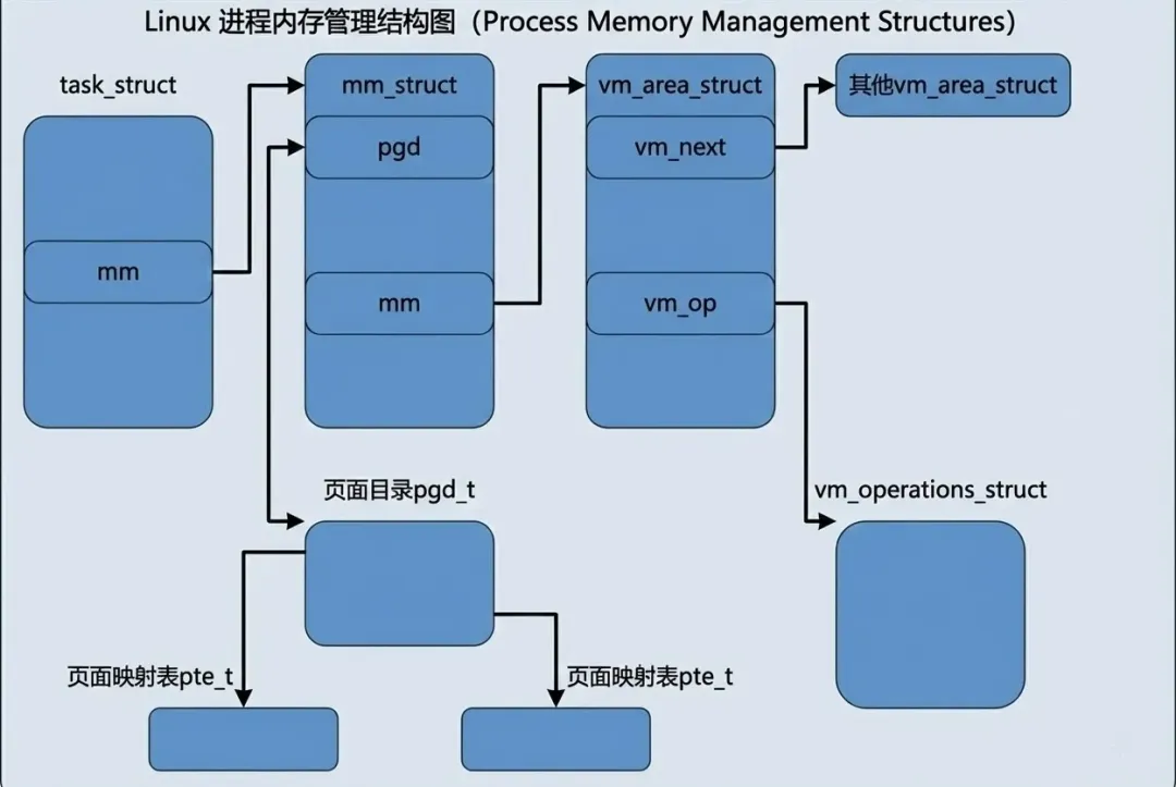 我们不妨转换视角:如果把 mm_struct 看作是掌管进程内存的“CEO”,它需要处理哪些维度的事务?