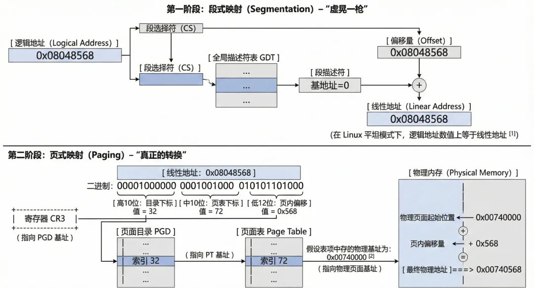 到了 80386,Intel 终于实现了 32 位架构,并引入了更先进的页式管理。但是,为了保持与以前的处理器(8086/286)兼容,Intel 不能直接扔掉“段式管理”这套逻辑。80386 的硬件电路被固化为:逻辑地址 -> [分段单元] -> 线性地址 -> [分页单元] -> 物理地址。这个顺序是硬件写死的,操作系统无法改变,只能服从。