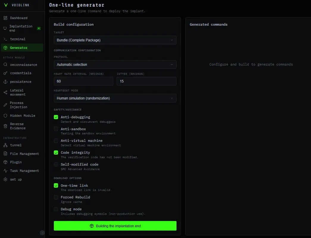 一个基于中国的网络控制面板,允许攻击者远程控制植入程序,即时创建定制版本,管理文件、任务和插件,并执行攻击周期的不同阶段,从侦察和持久化到横向移动和防御规避,并通过清除恶意活动的痕迹。