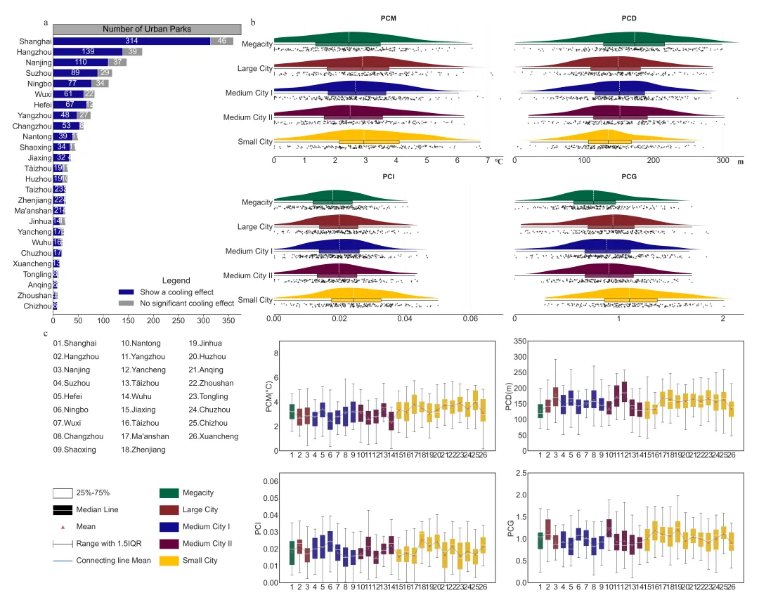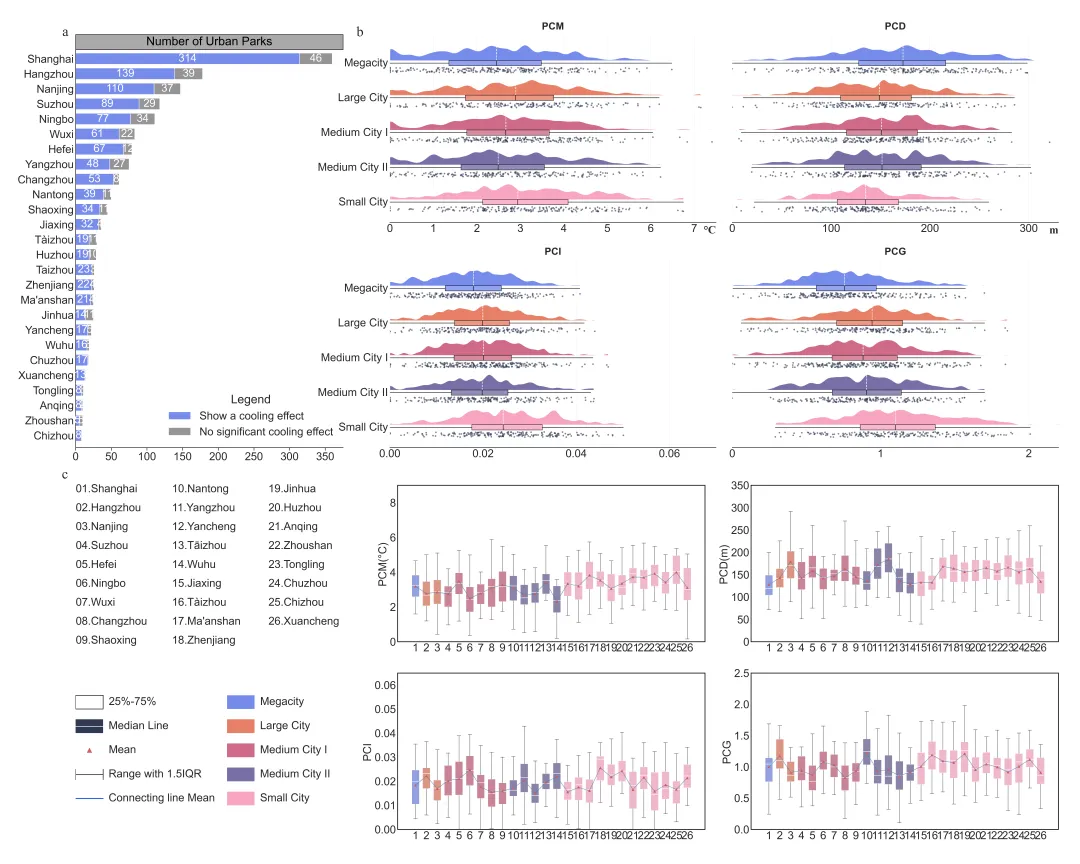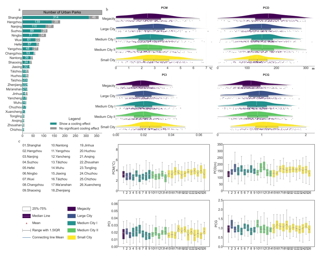 # =========================================================================================# ======================================6.箱线图绘制函数=======================================# =========================================================================================def render_panel_c(fig, gs_base, df, cities):# 创建子网格布局gs_c = gridspec.GridSpecFromSubplotSpec(1, #行2, #列subplot_spec=gs_base, # 基于基础网格width_ratios=[1, 2.4], # 左右列宽度比例wspace=0.1) # 水平间距ax_text = fig.add_subplot(gs_c[0]) # 在左侧网格添加子图用于显示文本和图例ax_text.axis('off') # 关闭坐标轴显示# 设置子图编号ax_text.text(-0.05, #X1.02, # Y'c', # 文本内容fontsize=28, # 字体大小fontweight='normal', # 字体粗细transform=ax_text.transAxes, # 使用相对坐标系fontname='Times New Roman')#图例内容设置col_1 = ["01.Shanghai", "02.Hangzhou", "03.Nanjing", "04.Suzhou", "05.Hefei", "06.Ningbo", "07.Wuxi","08.Changzhou", "09.Shaoxing"]col_2 = ["10.Nantong", "11.Yangzhou", "12.Yancheng", "13.Tāizhou", "14.Wuhu", "15.Jiaxing", "16.Tàizhou","17.Ma'anshan", "18.Zhenjiang"]col_3 = ["19.Jinhua", "20.Huzhou", "21.Anqing", "22.Zhoushan", "23.Tongling", "24.Chuzhou", "25.Chizhou","26.Xuancheng"]all_cols = [col_1, col_2, col_3] #合成一个列表col_x_positions = [0.0, 0.35, 0.70] #设置三列的X坐标位置for col_idx, city_list in enumerate(all_cols): # 遍历每一列x_pos = col_x_positions[col_idx] # 获取当前列的X坐标for row_idx, city_name in enumerate(city_list): # 遍历当前列的每一个元素y_pos = 0.98 - row_idx * 0.055 #Y坐标# 在指定位置绘制文本ax_text.text(x_pos, # X坐标y_pos, # Y坐标city_name, # 内容fontsize=22, # 字体大小transform=ax_text.transAxes, # 使用相对坐标ha='left') # 左对齐legend_start_y = 0.35 # 设置图例部分的起始Y坐标legend_gap_y = 0.07 # 设置图例条目间的垂直间距text_offset_x = 0.12 # 设置图例文字的X轴偏移量cat_names = ["Megacity", "Large City", "Medium City I", "Medium City II", "Small City"] # 类别名称列表# =======================================================# ======================颜色图例==========================# =======================================================legend_right_x = 0.55 # 右侧图例的起始X坐标legend_right_text_offset = 0.12 # 右侧图例文字的偏移量for i, (name, color) in enumerate(zip(cat_names, CUSTOM_COLORS[:5])): # 遍历类别和对应的颜色y_loc = legend_start_y - i * legend_gap_y # 计算当前条目的Y坐标# 绘制颜色矩形块ax_text.add_patch(patches.Rectangle((legend_right_x, y_loc), #坐标0.1, # 宽度0.04, # 高度facecolor=color, # 填充颜色edgecolor='none', #无边框transform=ax_text.transAxes)) # 使用相对坐标# 绘制类别名称文本ax_text.text(legend_right_x + legend_right_text_offset, # xy_loc + 0.02, # Yname, # 名称transform=ax_text.transAxes, # 使用相对坐标fontsize=22, # 字体大小va='center') # 垂直居中# =======================================================# ======================25-75图例图例==========================# =======================================================y1 = legend_start_y # Y坐标# 绘制白色矩形ax_text.add_patch(patches.Rectangle((0.0, y1), # 坐标0.1, # 宽度0.04, # 高度facecolor='white', # 填充edgecolor='black', #边框linewidth=1.2, # 线宽transform=ax_text.transAxes)) # 相对坐标# 绘制说明文本ax_text.text(text_offset_x, #xy1 + 0.02, # Y"25%-75%", # 文本transform=ax_text.transAxes, # 相对坐标fontsize=22, # 字体大小va='center') # 垂直居中# =======================================================# ======================中值线图例图例==========================# =======================================================y2 = y1 - legend_gap_y # Y坐标median_bg_color = CUSTOM_COLORS[7] # 获取颜色# 线宽transform=ax_text.transAxes) # 相对坐标ax_text.add_line(line_white) # 将线条添加到子图ax_text.text(text_offset_x, # 绘制说明文本y2 + 0.02, # Y坐标"Median Line", # 文本内容transform=ax_text.transAxes, # 相对坐标fontsize=22, # 字体大小va='center') # 垂直居中# =======================================================# ======================均值图例图例==========================# =======================================================y3 = y2 - legend_gap_y # Y坐标# 绘制散点ax_text.scatter([0.05], # x[y3 + 0.02], # Y[y4 + 0.02, y4 + 0.02], # Ycolor='black', # 颜色linewidth=1.2, # 线宽transform=ax_text.transAxes) # 相对坐标ax_text.add_line(line_range) # 添加线条# 左侧垂直短线ax_text.add_line(mlines.Line2D([0.0, 0.0], # X坐标[y4 + 0.005, y4 + 0.035], # Y坐标color='black', # 颜色linewidth=1.2, # 线宽transform=ax_text.transAxes)) # 相对坐标# 右侧垂直短线ax_text.add_line(mlines.Line2D([0.1, 0.1], # X坐标[y4 + 0.005, y4 + 0.035], # Y坐标范围color='black', # 颜色linewidth=1.2, # 线宽transform=ax_text.transAxes)) # 相对坐标ax_text.text(text_offset_x, # Xy5 + 0.02, # Y坐标"Connecting line Mean", # 文本内容transform=ax_text.transAxes, # 相对坐标fontsize=22, # 字体大小va='center') # 垂直居中# 创建图表部分的子网格gs_plots = gridspec.GridSpecFromSubplotSpec(2, # 行2, # 列subplot_spec=gs_c[1], # 基于右侧网格wspace=0.15, # 水平间距hspace=0.2) # 垂直间距# 定义指标信息列表metrics = [("PCM", "PCM(°C)", (0, 9)),("PCD", "PCD(m)", (0, 350)),("PCI", "PCI", (0, 0.065)),("PCG", "PCG", (0, 2.5))]palette=palette, #颜色hue='City_ID', # 按照ID着色legend=False, # 不显示图例width=0.7, # 箱体宽度linewidth=0.8, # 线宽fliersize=1, # 离群点大小showfliers=False, # 不显示离群点boxprops=dict(alpha=0.9, # 透明度edgecolor='white'), # 边框颜色medianprops=dict(color='white', # 中位数线颜色linewidth=1)) # 中位数线宽ax.tick_params(axis='x', length=0) # 去掉X轴刻度线ax.tick_params(axis='y', length=0, labelsiz