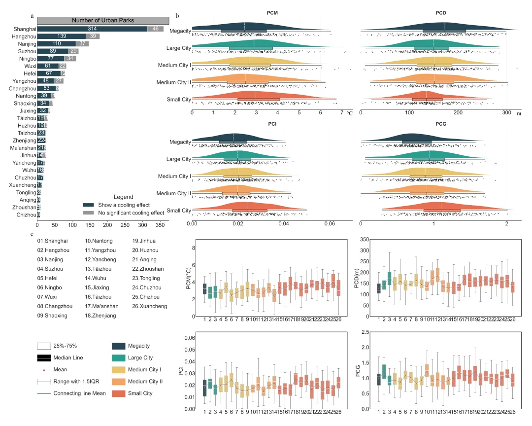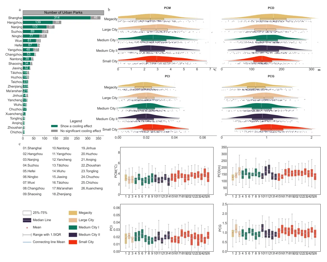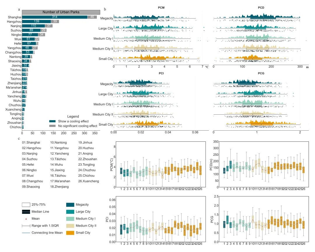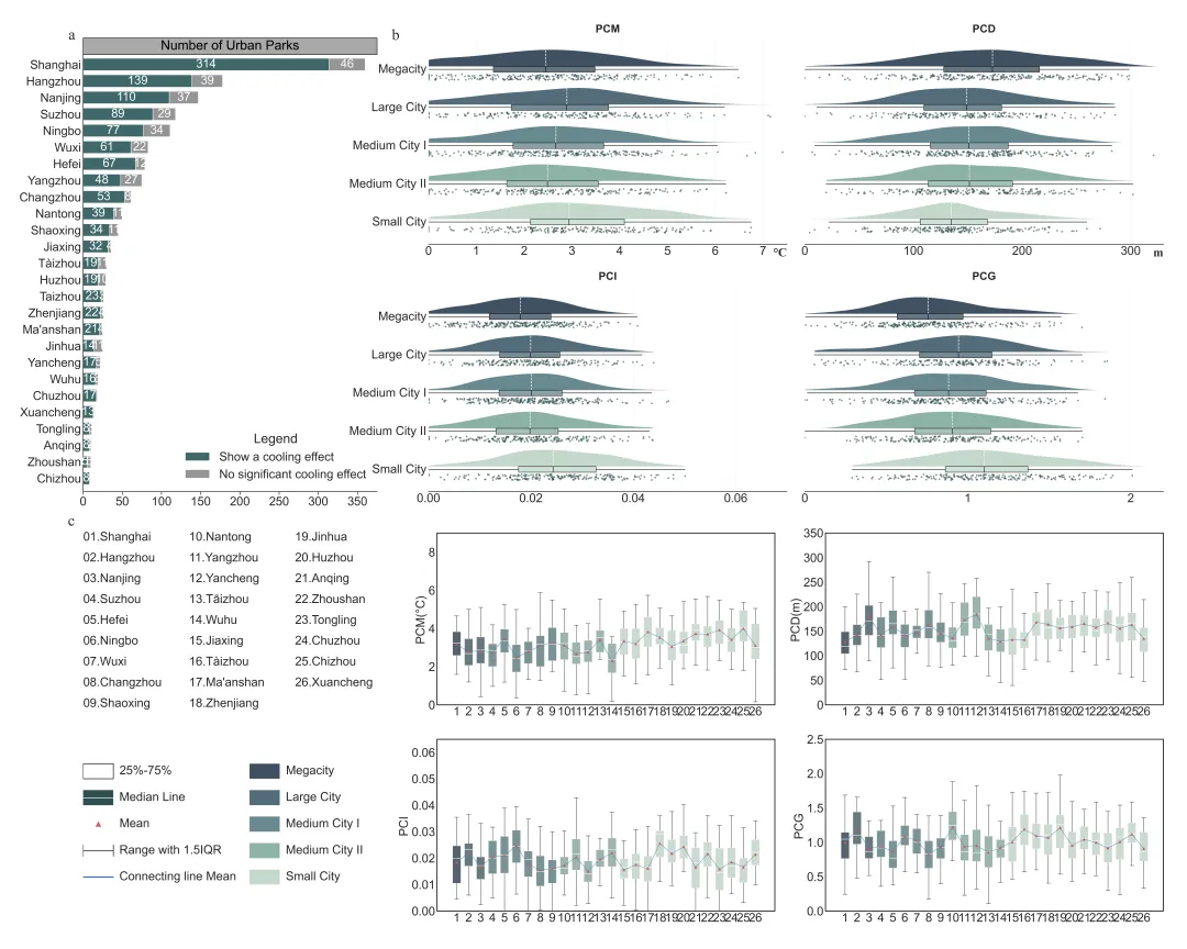 # =========================================================================================# ======================================6.箱线图绘制函数=======================================# =========================================================================================def render_panel_c(fig, gs_base, df, cities):# 创建子网格布局gs_c = gridspec.GridSpecFromSubplotSpec(1, #行2, #列subplot_spec=gs_base, # 基于基础网格width_ratios=[1, 2.4], # 左右列宽度比例wspace=0.1) # 水平间距ax_text = fig.add_subplot(gs_c[0]) # 在左侧网格添加子图用于显示文本和图例ax_text.axis('off') # 关闭坐标轴显示# 设置子图编号ax_text.text(-0.05, #X1.02, # Y'c', # 文本内容fontsize=28, # 字体大小fontweight='normal', # 字体粗细transform=ax_text.transAxes, # 使用相对坐标系fontname='Times New Roman')#图例内容设置col_1 = ["01.Shanghai", "02.Hangzhou", "03.Nanjing", "04.Suzhou", "05.Hefei", "06.Ningbo", "07.Wuxi","08.Changzhou", "09.Shaoxing"]col_2 = ["10.Nantong", "11.Yangzhou", "12.Yancheng", "13.Tāizhou", "14.Wuhu", "15.Jiaxing", "16.Tàizhou","17.Ma'anshan", "18.Zhenjiang"]col_3 = ["19.Jinhua", "20.Huzhou", "21.Anqing", "22.Zhoushan", "23.Tongling", "24.Chuzhou", "25.Chizhou","26.Xuancheng"]all_cols = [col_1, col_2, col_3] #合成一个列表col_x_positions = [0.0, 0.35, 0.70] #设置三列的X坐标位置for col_idx, city_list in enumerate(all_cols): # 遍历每一列x_pos = col_x_positions[col_idx] # 获取当前列的X坐标for row_idx, city_name in enumerate(city_list): # 遍历当前列的每一个元素y_pos = 0.98 - row_idx * 0.055 #Y坐标# 在指定位置绘制文本ax_text.text(x_pos, # X坐标y_pos, # Y坐标city_name, # 内容fontsize=22, # 字体大小transform=ax_text.transAxes, # 使用相对坐标ha='left') # 左对齐legend_start_y = 0.35 # 设置图例部分的起始Y坐标legend_gap_y = 0.07 # 设置图例条目间的垂直间距text_offset_x = 0.12 # 设置图例文字的X轴偏移量cat_names = ["Megacity", "Large City", "Medium City I", "Medium City II", "Small City"] # 类别名称列表# =======================================================# ======================颜色图例==========================# =======================================================legend_right_x = 0.55 # 右侧图例的起始X坐标legend_right_text_offset = 0.12 # 右侧图例文字的偏移量for i, (name, color) in enumerate(zip(cat_names, CUSTOM_COLORS[:5])): # 遍历类别和对应的颜色y_loc = legend_start_y - i * legend_gap_y # 计算当前条目的Y坐标# 绘制颜色矩形块ax_text.add_patch(patches.Rectangle((legend_right_x, y_loc), #坐标0.1, # 宽度0.04, # 高度facecolor=color, # 填充颜色edgecolor='none', #无边框transform=ax_text.transAxes)) # 使用相对坐标# 绘制类别名称文本ax_text.text(legend_right_x + legend_right_text_offset, # xy_loc + 0.02, # Yname, # 名称transform=ax_text.transAxes, # 使用相对坐标fontsize=22, # 字体大小va='center') # 垂直居中# =======================================================# ======================25-75图例图例==========================# =======================================================y1 = legend_start_y # Y坐标# 绘制白色矩形ax_text.add_patch(patches.Rectangle((0.0, y1), # 坐标0.1, # 宽度0.04, # 高度facecolor='white', # 填充edgecolor='black', #边框linewidth=1.2, # 线宽transform=ax_text.transAxes)) # 相对坐标# 绘制说明文本ax_text.text(text_offset_x, #xy1 + 0.02, # Y"25%-75%", # 文本transform=ax_text.transAxes, # 相对坐标fontsize=22, # 字体大小va='center') # 垂直居中# =======================================================# ======================中值线图例图例==========================# =======================================================y2 = y1 - legend_gap_y # Y坐标median_bg_color = CUSTOM_COLORS[7] # 获取颜色# 线宽transform=ax_text.transAxes) # 相对坐标ax_text.add_line(line_white) # 将线条添加到子图ax_text.text(text_offset_x, # 绘制说明文本y2 + 0.02, # Y坐标"Median Line", # 文本内容transform=ax_text.transAxes, # 相对坐标fontsize=22, # 字体大小va='center') # 垂直居中# =======================================================# ======================均值图例图例==========================# =======================================================y3 = y2 - legend_gap_y # Y坐标# 绘制散点ax_text.scatter([0.05], # x[y3 + 0.02], # Y[y4 + 0.02, y4 + 0.02], # Ycolor='black', # 颜色linewidth=1.2, # 线宽transform=ax_text.transAxes) # 相对坐标ax_text.add_line(line_range) # 添加线条# 左侧垂直短线ax_text.add_line(mlines.Line2D([0.0, 0.0], # X坐标[y4 + 0.005, y4 + 0.035], # Y坐标color='black', # 颜色linewidth=1.2, # 线宽transform=ax_text.transAxes)) # 相对坐标# 右侧垂直短线ax_text.add_line(mlines.Line2D([0.1, 0.1], # X坐标[y4 + 0.005, y4 + 0.035], # Y坐标范围color='black', # 颜色linewidth=1.2, # 线宽transform=ax_text.transAxes)) # 相对坐标ax_text.text(text_offset_x, # Xy5 + 0.02, # Y坐标"Connecting line Mean", # 文本内容transform=ax_text.transAxes, # 相对坐标fontsize=22, # 字体大小va='center') # 垂直居中# 创建图表部分的子网格gs_plots = gridspec.GridSpecFromSubplotSpec(2, # 行2, # 列subplot_spec=gs_c[1], # 基于右侧网格wspace=0.15, # 水平间距hspace=0.2) # 垂直间距# 定义指标信息列表metrics = [("PCM", "PCM(°C)", (0, 9)),("PCD", "PCD(m)", (0, 350)),("PCI", "PCI", (0, 0.065)),("PCG", "PCG", (0, 2.5))]palette=palette, #颜色hue='City_ID', # 按照ID着色legend=False, # 不显示图例width=0.7, # 箱体宽度linewidth=0.8, # 线宽fliersize=1, # 离群点大小showfliers=False, # 不显示离群点boxprops=dict(alpha=0.9, # 透明度edgecolor='white'), # 边框颜色medianprops=dict(color='white', # 中位数线颜色linewidth=1)) # 中位数线宽ax.tick_params(axis='x', length=0) # 去掉X轴刻度线ax.tick_params(axis='y', length=0, labelsiz