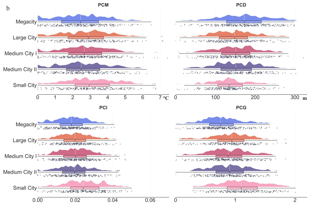 # =========================================================================================# ======================================5.云雨图绘制函数=======================================# =========================================================================================def render_panel_b(fig, gs_base, df):# 定义指标信息列表,包含名称、单位、X轴范围、X轴刻度metrics_info = [("PCM", "°C", (0, 7.5), [0, 1, 2, 3, 4, 5, 6, 7]),("PCD", "m", (0, 330), [0, 100, 200, 300]),("PCI", "", (0, 0.07), [0, 0.02, 0.04, 0.06]),("PCG", "", (0, 2.2), [0, 1, 2])]categories = ["Megacity", "Large City", "Medium City I", "Medium City II", "Small City"] # 定义区域分类列表categories_rev = categories[::-1] # 将分类列表反转y_positions = np.arange(len(categories)) # 生成Y轴位置索引color_map = {cat: col for cat, col in zip(categories, CUSTOM_COLORS[:5])} # 创建类别到颜色的映射字典if len(cat_data) == 0: # 如果没有数据,则跳过continuewidth=0.45) # 宽度# 绘制箱线图ax.boxplot([cat_data], # 数据positions=[y_base + 0.08], # 箱线图位置vert=False, # 水平方向widths=0.15, #箱体宽度patch_artist=True, # 填充颜色showfliers=False, # 不显示离群点showcaps=False, # 不显示箱线图的帽子medianprops={"color": "black", # 中位数线颜色"linewidth": 1}, # 中位数线宽boxprops={"facecolor": color, # 箱体填充颜色"edgecolor": "black", # 箱体边框颜色"linewidth": 1, # 箱体边框线宽"alpha": 0.8}, # 透明度whiskerprops={"color": "black", # 须线颜色"linewidth": 1}) # 须线宽度jitter = np.random.uniform(-0.15, 0.0, size=len(cat_data)) # 生成随机抖动值median_bg_color = CUSTOM_COLORS[7] # 获取用于散点的颜色# 绘制散点图ax.scatter(cat_data, # x轴数据y_base + jitter - 0.05, # y轴数据s=6, # 散点的大小color=median_bg_color, # 散点的颜色alpha=0.5, # 透明度zorder=0)# 设置子图标题ax.set_title(metric, #名称fontsize=20, #字体大小pad=10, # 标题距离fontweight='bold') #加粗#设置X轴标签单位ax.set_xlabel(unit,loc='right',labelpad=-16, fontweight='bold', fontname='Times New Roman',fontsize=22)ax.set_xlim(xlim) # X轴范围ax.set_yticklabels(categories_rev, fontsize=22) # 显示类别名称作为Y轴标签ax.tick_params(axis='y', length=0) # Y轴刻度线长度ax.spines['left'].set_visible(False) # 隐藏图框ax.spines['top'].set_visible(False) # 隐藏顶部图框ax.spines['right'].set_visible(False) # 隐藏右侧图框ax.spines['bottom'].set_visible(True) # 显示底部图框# 显示网格线ax.grid(axis='x', # X轴color='lightgrey', # 网格线颜色linestyle='-', # 网格线样式linewidth=0.5, # 网格线alpha=0.5) # 网格线pass