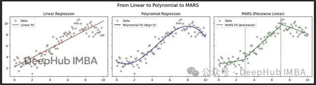 为了更好地理解MARS算法的技术优势,下面通过对比实验来展示线性回归、多项式回归和MARS方法在处理非线性数据时的不同表现。
