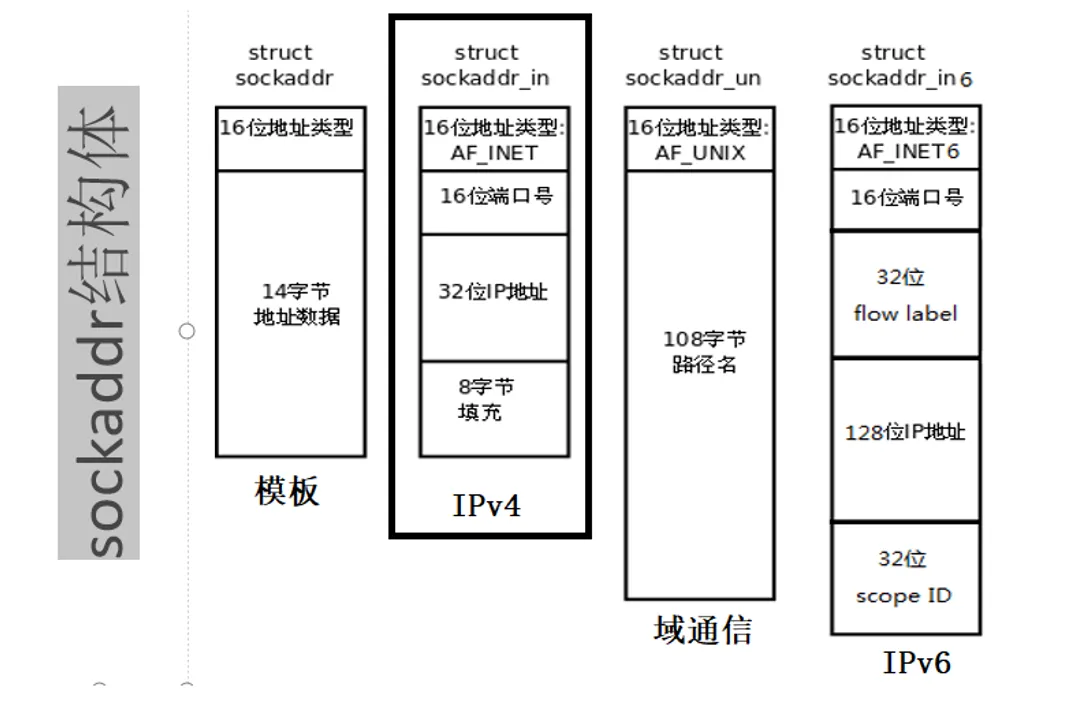 该结构体不适用:1>sa_date长度为14字节 IP和端口号合共6个字节因为自带的结构体不合适,所以引入了 struct sockaddr_instruct sockaddr_in{sa_family_t sin_family; //地址族 2个字节uint16_t sin_port; //端口号 2个字节 ---16位struct in_addr sin_addr; //32位IP地址 4个字节char sin_zero; //填充字节 8个字节};16个字节struct in_addr{IPv4地址赋值专用结构体In_addr_t s_addr; //32位IPv4地址};