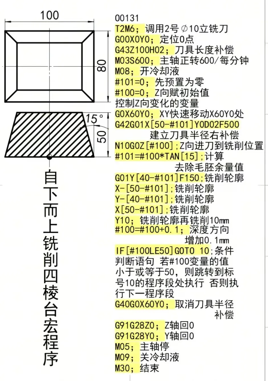 "X[50-#101]" 是“动态坐标”:因为四棱台有15°斜面,Z向下切时,X要往里缩(缩多少?看后面计算)。