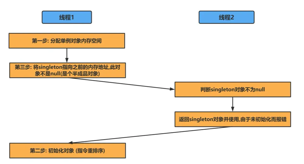 这时线程 2 进入 getInstance 方法,判断 singleton 对象不是 null,紧接着线程 2 就返回 singleton 对象并使用,由于没有初始化,所以报错了。最后,线程 1 “姗姗来迟”,才开始执行新建实例的第二步——初始化对象,可是这时的初始化已经晚了,因为前面已经报错了。
