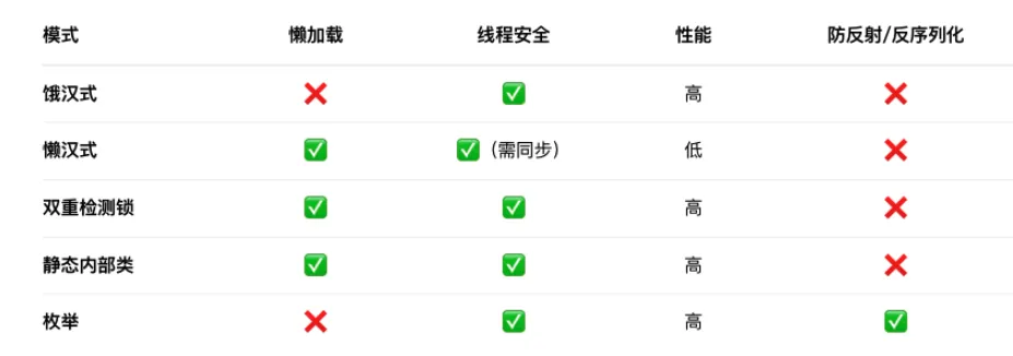实现单例 模式有多种方式,具体采用哪种取决于不同实现的特征,总结如下: