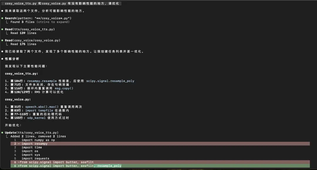 说 Claude Code 是最强编程助手还真不为过。但是这么好的工具可没那么容易用,首先他对大陆禁用。其次,不像我们习惯的IDE编程,它是Cli客户端编程,类似于早期互联网时代,靠敲击命令上网一样。爱折腾的人喜欢玩这种方式,但是普通用户看着都头大。尽管如此,我真正去用它还是有个过程,也不是一下子适应的,毕竟在这之前,IDEA,VS code,TRAE 都是我最爱的IDE开发工具,用着都习惯了,突然换成Cli 客户端工具好像一下子回到原始社会。最近被迫使用是因为 VS code的编程助手实在是差强人意,只能用一些像千问,deepseek这类国内大模型,对于我们这种效率至上的人来说,用这种模型真是浪费生命。因为这些编程模型属于初级程序员水平,偶尔能发挥好一些,算是中等,但是总体实力很一般。所以我的编程重任主要落在 TRAE 国际版上面,它支持当今主流大模型,像OpenAI 5.2系列,Grok,Claude等,但是 最近 因为受限制,TRAE 国际版也无法提供 Claude的模型了:剩下的这些模型中只有OpenAI 5.2 还好一些,其他编程能力也一般,但是O pen AI 也经常无法解决问题,所以需要在多个模型之间切换,这样一来TRAE 也就没啥吸引力了,主要是每个月 10美元 只能查询 600次,根本不够用。如果用其他转接的Claude 服务,TRAE 等平台都无法支持自定义 服务地址。这个时候 就得看起来比较原始的 IDE 工具出马了,因为这样真正做到了DIY。来看看Claude code 命令行工具,它需要在本地安装 npm 安装一个客户端,非常轻量,控制台界面也很清爽:其实看到这,实际上它比任何IDE工具都要简单好用,所以不要被我们的经验所束缚,往往强大的工具就是这么看起来low。启动命令前,配置claude的 url和 密钥,就是个环境变量的事。然后就可以在控制台输入 命令,让它帮你实现代码,找bug,实在是太爽了。比如我问:“cosy_voice_tts.py 和cosy_voice.py 有没有影响性能的地方,请优化”:提交后,它就开始规划路径,吭哧的干活了,而且从执行过程能看到非常逻辑清晰,专业:修改后通过前后代码可视化对比的方式,让你确认是否接受:说了半天,最后再介绍下Claude: