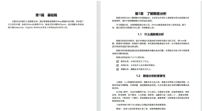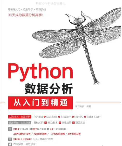 身处大数据时代,数据分析已经逐渐成为必备技能,python作为当今最火的数据分析工具之一,拥有丰富和强大的库,而且和其他编程语言相比较简单,只要认真学,小白也能入门。今天给大家分享一本绝佳的入门书籍《Python数据分析,从入门到精通》。这本书将从零开始,详细讲解Python数据分析的相关知识。无论你有没有Python基础,通过本书你都能最终成为数据分析高手。全书共分为14章,提供了从入门到成为数据分析高手所必需的各项知识,包括了解数据分析、搭建Python数据分析环境、Pandas统计分析、Matplotlib可视化数据分析图表、Scaborn可视化数据分析图表、第三方可视化数据分析图表Pyecharts、图解数组计算模块NumPy、数据统计分析案例、机器学习库Scikit-Learn、注册用户分析(MySQL版)、电商销售数据分析与预测,二手房房价分析与预测,以及客户价值分析。