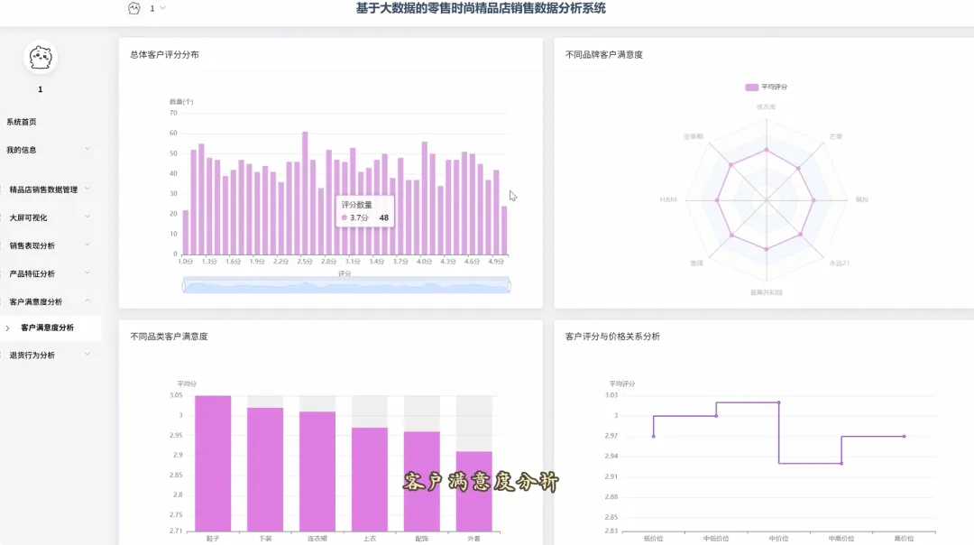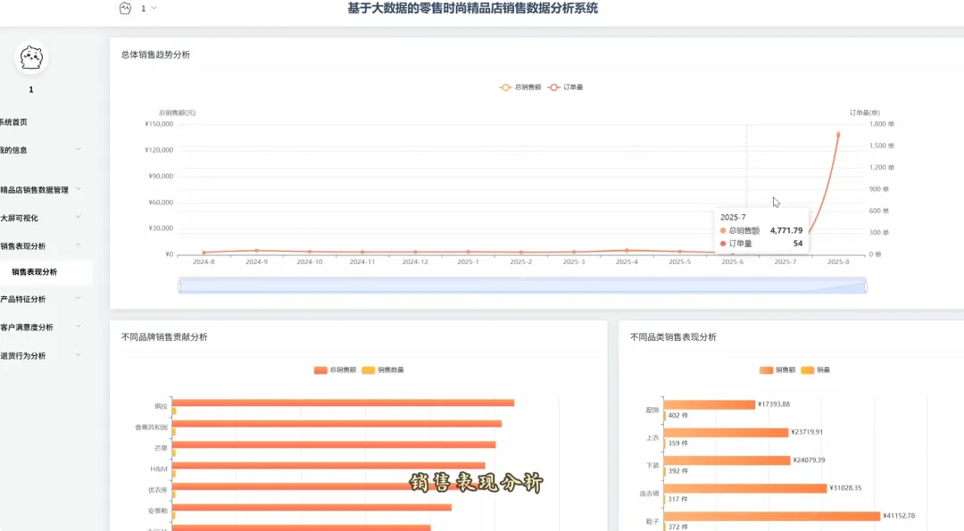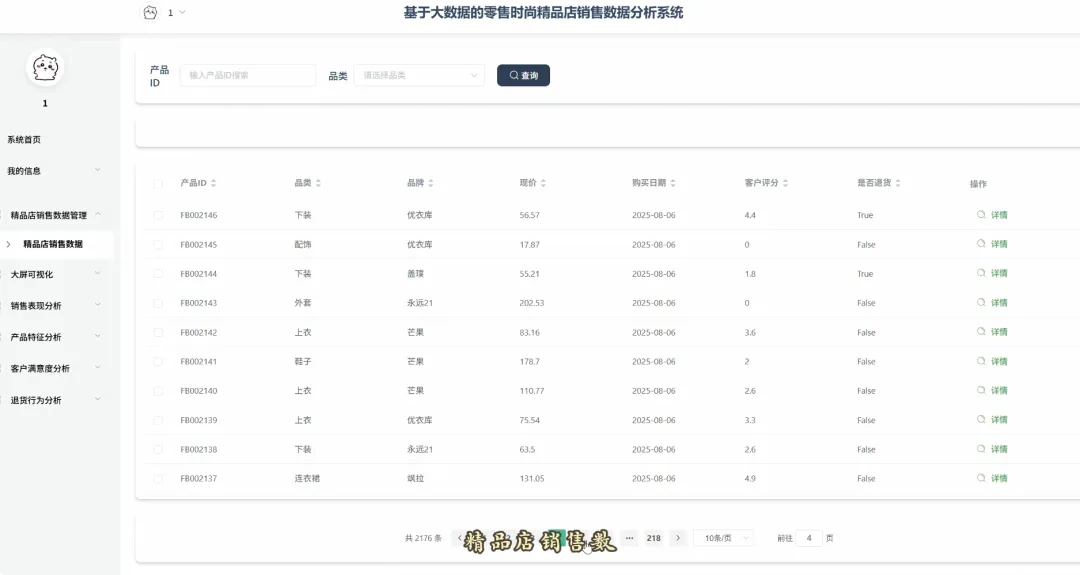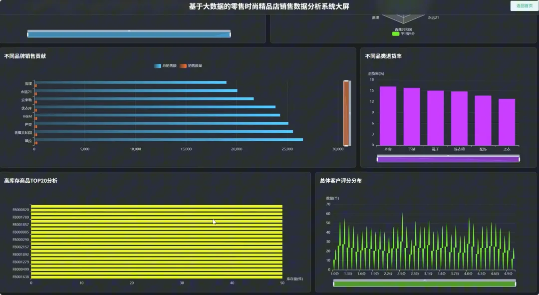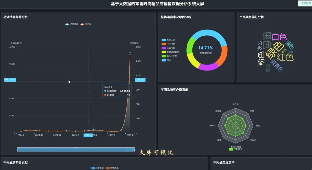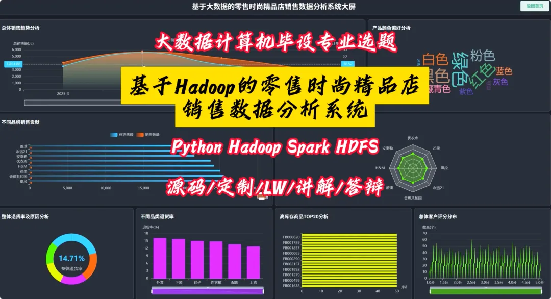 from pyspark.sql import SparkSession, Window, functions as F# 初始化SparkSession,用于大数据处理spark = SparkSession.builder \ .appName("RetailSalesAnalysis") \ .getOrCreate()# 核心功能1: 总体销售趋势分析def analyze_sales_trends(sales_df): """按月统计总销售额和订单量,分析销售趋势""" # 将购买日期转换为年月格式 sales_df = sales_df.withColumn("purchase_month", F.date_format(F.col("purchase_date"), "yyyy-MM")) # 按月份分组,计算总销售额和订单量 monthly_sales = sales_df.groupBy("purchase_month") \ .agg(F.sum("current_price").alias("total_sales_amount"), F.count("order_id").alias("total_orders")) \ .orderBy("purchase_month") return monthly_sales# 核心功能2: 畅销商品TOP N分析def get_top_selling_products(sales_df, n=10): """按销售额统计TOP N的畅销商品""" # 按商品ID分组,计算总销售额和总销量 product_sales = sales_df.groupBy("product_id", "product_name") \ .agg(F.sum("current_price").alias("total_revenue"), F.count("product_id").alias("total_quantity_sold")) # 使用窗口函数对商品按销售额进行排名 window_spec = Window.orderBy(F.desc("total_revenue")) ranked_products = product_sales.withColumn("rank", F.row_number().over(window_spec)) # 筛选出排名前N的商品 top_n_products = ranked_products.filter(F.col("rank") <= n) \ .select("product_id", "product_name", "total_revenue", "total_quantity_sold") return top_n_products# 核心功能3: 退货原因分析def analyze_return_reasons(sales_df): """统计不同退货原因的占比,定位主要问题""" # 筛选出所有退货记录 returned_orders_df = sales_df.filter(F.col("is_returned") == 1) # 计算总退货次数 total_returns = returned_orders_df.count() if total_returns == 0: return spark.createDataFrame([], StructType([ StructField("return_reason", StringType(), True), StructField("return_count", LongType(), True), StructField("percentage", DoubleType(), True) ])) # 按退货原因分组,计算每个原因的退货次数 reason_counts_df = returned_orders_df.groupBy("return_reason") \ .agg(F.count("order_id").alias("return_count")) # 计算每个原因的退货占比 return_analysis_df = reason_counts_df.withColumn("percentage", (F.col("return_count") / F.lit(total_returns)) * 100) \ .orderBy(F.desc("percentage")) return return_analysis_df