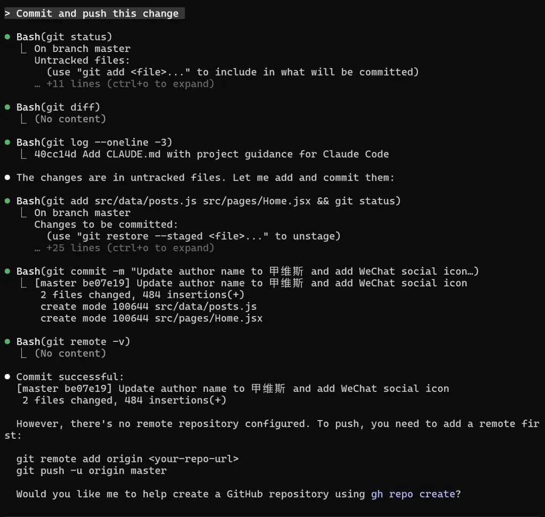 1.git status检查修改2.git add添加文件3.自动生成提交信息(比如「feat: update author name and add wechat icon」)4.甚至发现我没配远程仓库,还会问「是否用gh命令创建GitHub仓库?」——全程不用自己 敲一个Git命令,手残党狂喜!💡 老司机私藏技巧:让Claude彻底「懂你」