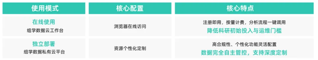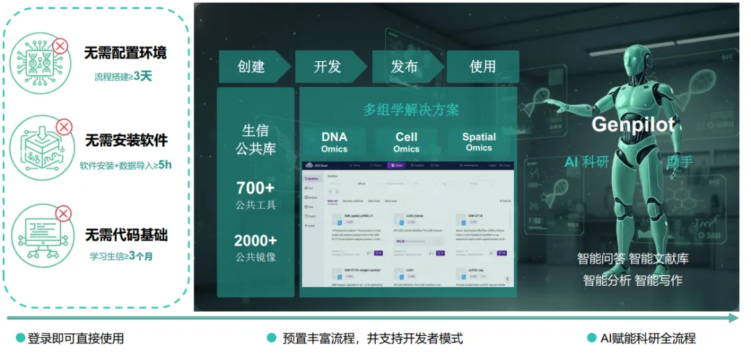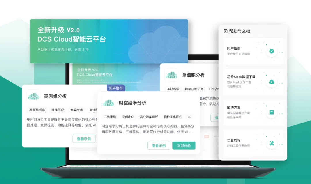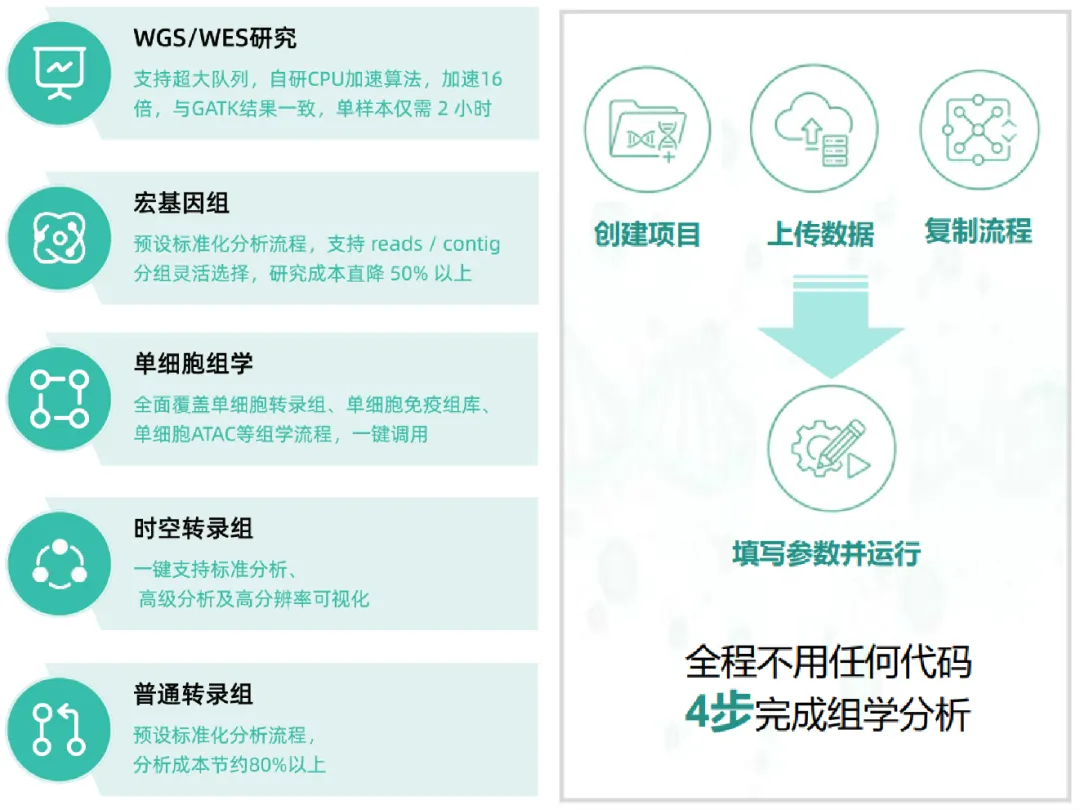 ● 单细胞/时空组学/基因组/转录组/宏基因组等标准化流程一键调用,4步完成从数据上传到报告生成;