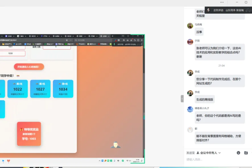 云端相聚,收获满满本次直播活动历时 2 小时,线上参与人数超 500 人,互动留言突破 100 条。直播间内,大家纷纷点赞张老师的实用分享,不少老师实时留言反馈:“这个场地工具太及时了,下周备课就能用!”“原来 AI 编程离体育教学这么近,终于找到入门方向了!”从工具演示到案例解析,从理论分享到互动答疑,每一个环节都凝聚着嘉宾的用心与参与者的热情,这场云端交流不仅传递了知识,更搭建了体育教育同仁相互学习、共同进步的桥梁。