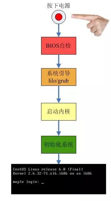 OK,我们言归正传。对于一台安装了Linux系统的主机来说,当用户按下开机按钮时,一共要经历以下几个过程,如图:
