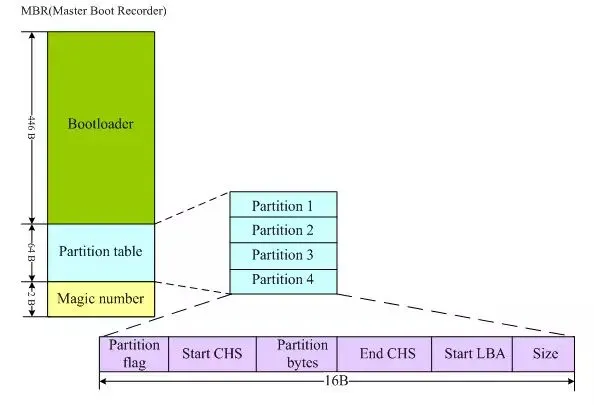 我们首先来了解一下MBR,它是Master Boot Record的缩写。硬盘的0柱面、0磁头、1扇区称为主引导扇区。它由三个部分组成,主引导程序(Bootloader)、 硬盘分区表DPT(Disk Partition table)和硬盘有效标志(55AA),其结构图如下所示: