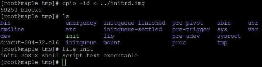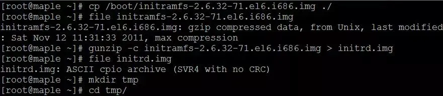 疑惑的是:我的内核是2.6.32-71.el6.i686版本,但在我的/boot分区下面却存在的是/boot/initramfs-2.6.32-71.el6.i686.img类型的文件,没搞明白,还望高人解惑。我只知道在2.6内核中支持两种格式的initrd,一种是2.4内核的文件系统镜像image-initrd,一种是cpio格式。接下来我们就来探究一下initramfs-2.6.32-71.el6.i686.img里到底放了那些东西。