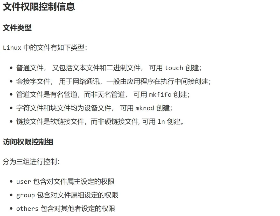输出中, 第1个字符表示文件类型,其中,普通文件(-)、目录文件 (d)、套接字文件(s),管道文件(p),字符文件(c),块文件(b),链接文件(l); 第2个字符开始的 -rwxr-xr-x 部分表示文件的权限位,共有9位。