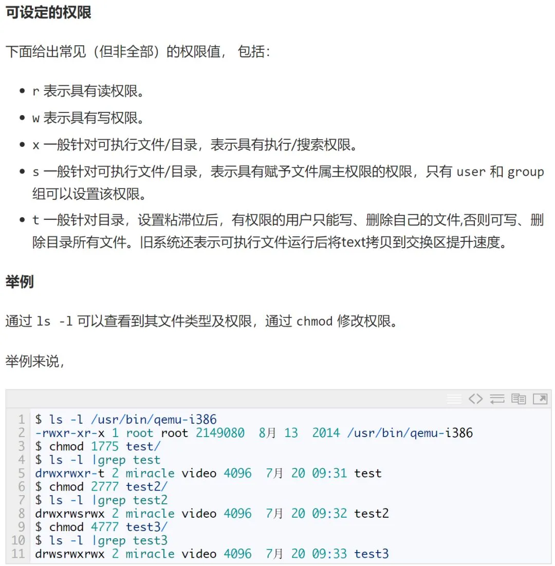 s,t 权限会替代 x 位置显示;设定 s,t 权限则需在对应的、用于控制 r,w,x 的8进制权限控制组前追加数字; s 权限用于属主属组控制, t 用于其它控制。