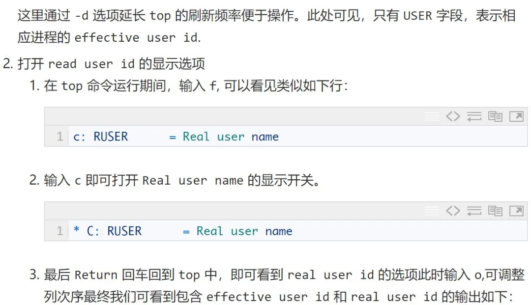 我们可以使用 ps 和 top 选择查看具有 euid 和 ruid 的进程。或者通过 top 来查看进程的 euid 和 ruid