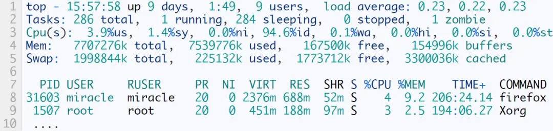首先输入 top 得到类似如下