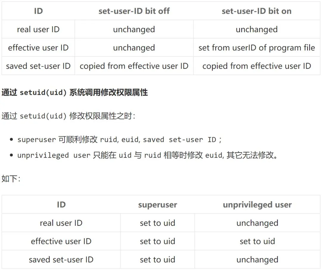实际上,我们描述 man 使用 setuid 函数的方法不是特别正确,因为程序可能会 set-user-ID 为 root .这时候, setuid 会把所有三种uid都变成你设置的id,但是我们只需要设置 effective user ID。