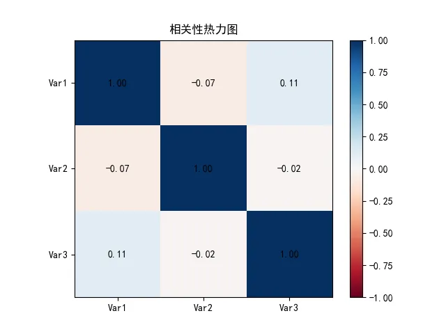 import matplotlib.pyplot as pltimport numpy as np# 示例:3个变量的随机数据np.random.seed(0)X = np.random.randn(100, 3)# 计算相关系数矩阵corr = np.corrcoef(X, rowvar=False) # shape (3,3)# 画热力图plt.imshow(corr, cmap='RdBu', vmin=-1, vmax=1)plt.colorbar()plt.title("相关性热力图")# 添加文本标注for i in range(corr.shape[0]):for j in range(corr.shape[1]):plt.text(j, i, f"{corr[i, j]:.2f}",ha="center", va="center", color="white")plt.xticks(range(3), ['Var1', 'Var2', 'Var3'])plt.yticks(range(3), ['Var1', 'Var2', 'Var3'])plt.show()