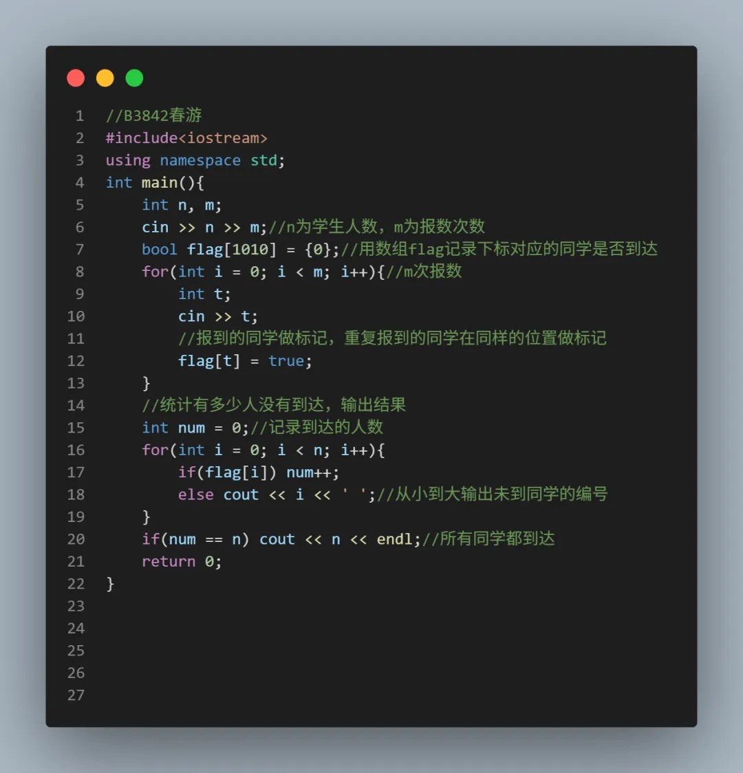 思路:用flag数组来对N名同学的报数状态进行标记,再检查并输出未报数的同学编号。如果所有的同学都报数,则输出N。