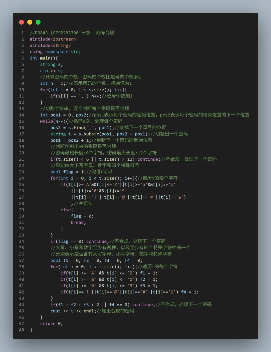 思路:用string字符串处理更方便,切割字符串,依次取出每个密码,判断取出的密码是否合规,对于合规的密码,进行输出并换行。