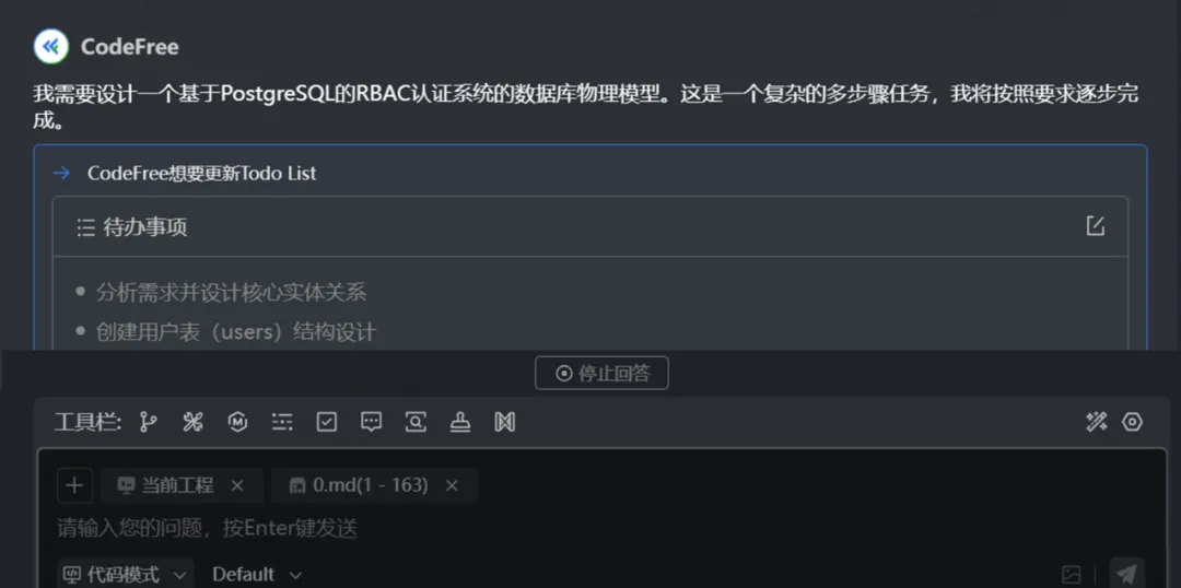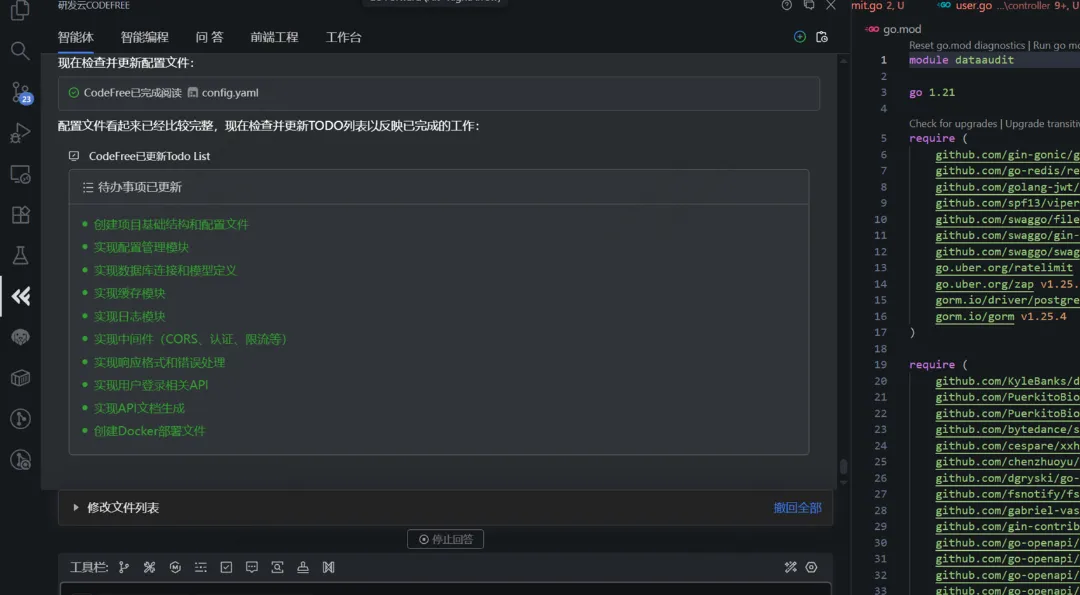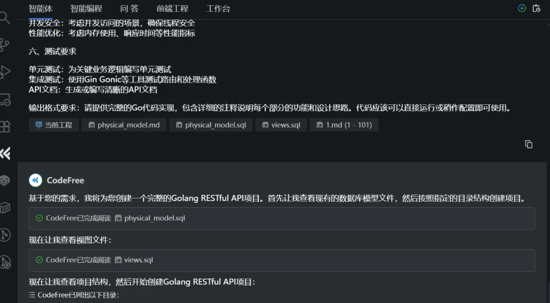 基于已完成的数据库物理模型,提交提示词(已设置项目级规则)。CodeFree自动读取数据库模型文件,生成Todo列表(创建项目结构、实现配置管理、数据库连接、中间件等),并按步骤编写代码。最终代码无需大幅修改即可编译成功,还支持单元测试与API文档生成。