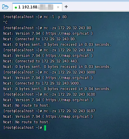 通过上图可以看出,远端主机172.29.32.243的80、443、9000端口是开放的,9100和9187端口是关闭的。