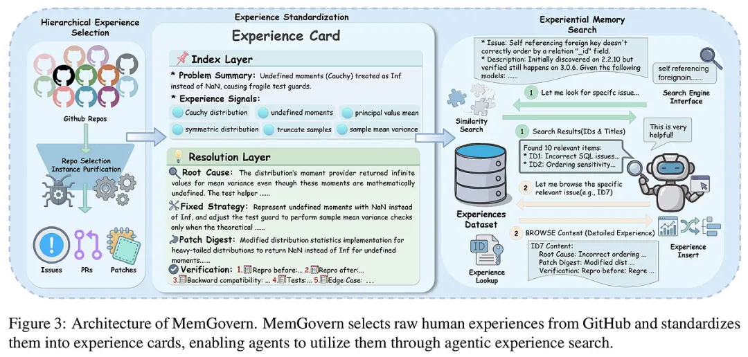 MemGovern通过三阶段治理流程实现经验的高质量标准化:(1)经验筛选:基于仓库活跃度和维护强度筛选优质仓库,确保数据来源权威;同时在实例层面筛除无效或噪声过多的Issue-PR-Patch三元组,保证经验完整性和技术含量;(2)经验标准化:定义统一的修复经验协议,将冗长杂乱的讨论压缩并拆分为两层——索引层(问题摘要与诊断信号)和解决层(根因分析、修复策略与补丁摘要),实现检索语义与修复逻辑的解耦;(3)质量控制:引入基于清单的质量评估机制,利用LLM结构化评分及多轮反馈修正,确保经验卡片的准确性和可靠性。