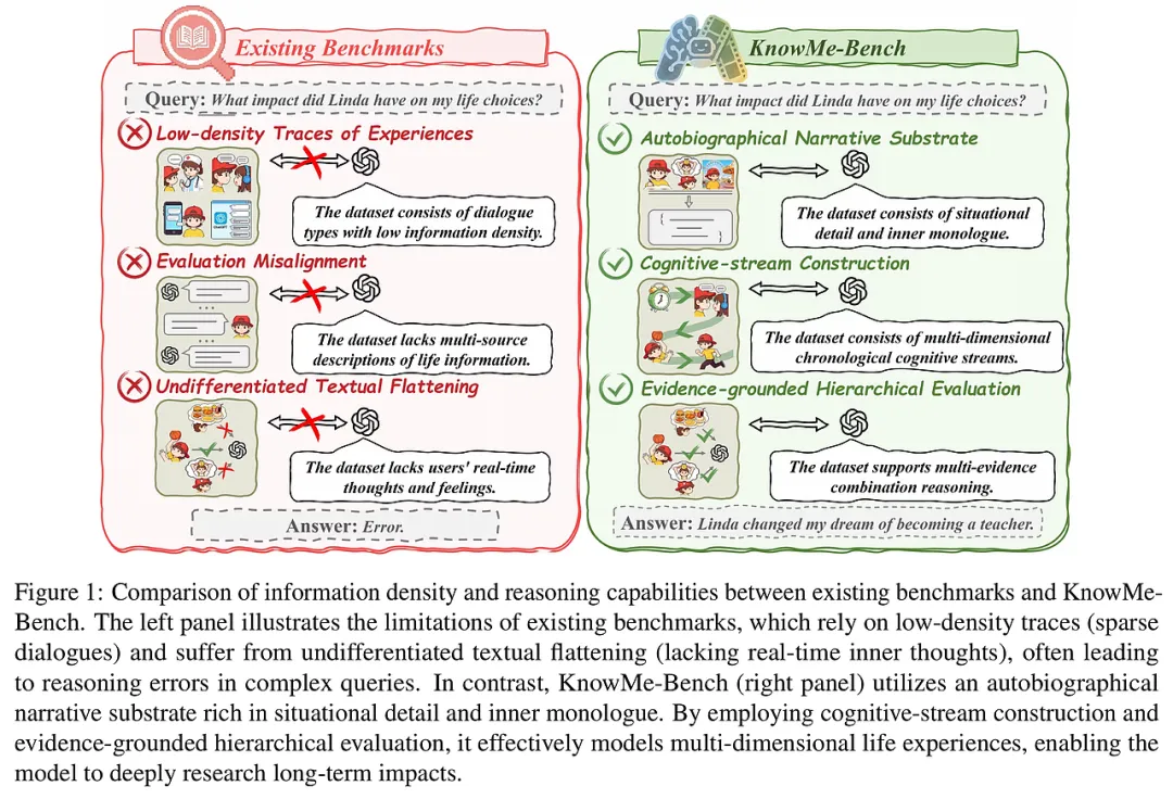 本文旨在提出一个以自传式叙事文本为数据基础的全新评测框架——KnowMe-Bench,通过高密度、多模态的认知流重建和层级化、证据链驱动的评估,推动数字伴侣领域从简单检索向深度人模型推理转变。