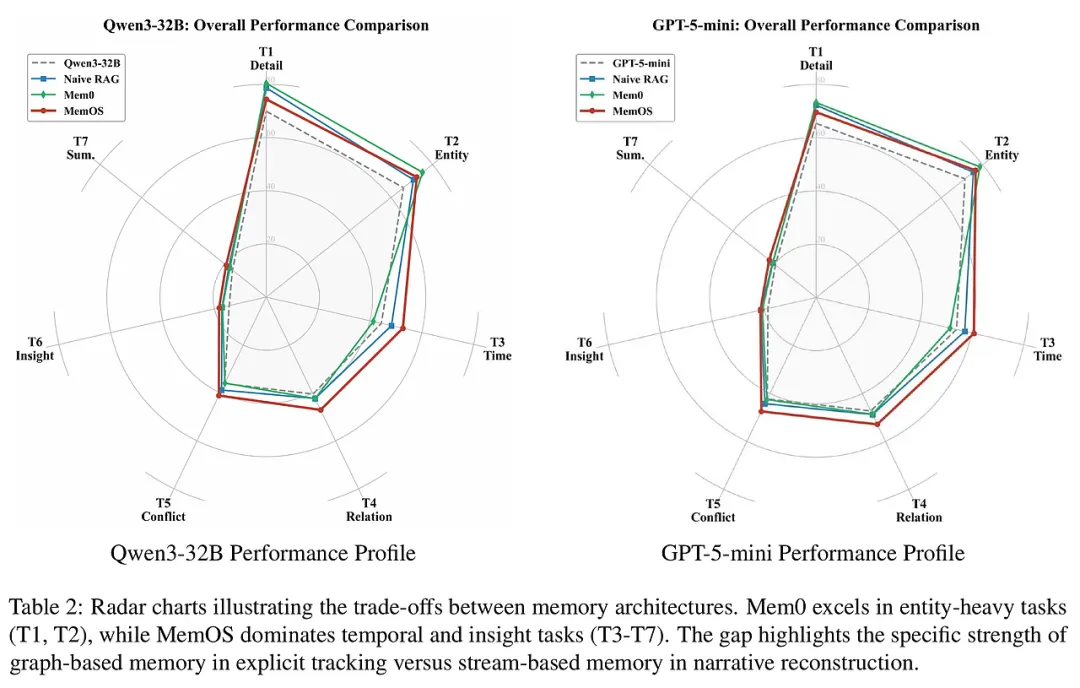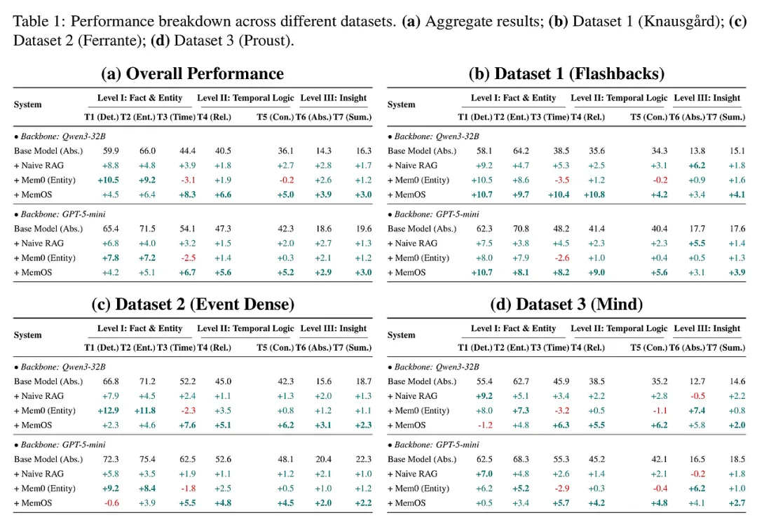 - 逻辑层面:流式认知系统MemOS在时间推理和事件逻辑排序任务中表现突出,尤其擅长处理闪回等非线性时间结构。