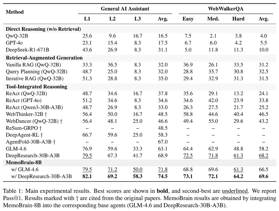 MemoBrain集成于强基线GLM-4.6和DeepResearch-30B-A3B上,结果表现出: