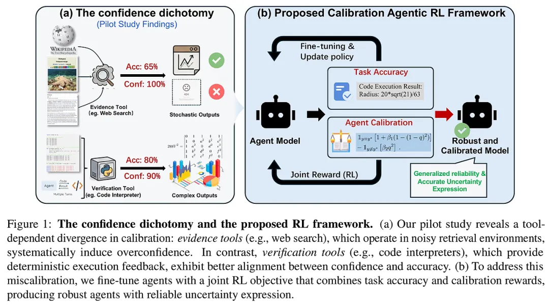 - 挑战与目标:现有研究表明,基于证据检索的工具(如网络搜索)往往引入噪声,导致智能体过度自信;而基于验证的工具(如代码解释器)通过确定性反馈,有助于缓解误校准问题。本文旨在系统分析不同工具类型对智能体置信度的影响,揭示“置信度二分法”,并提出针对性校准优化方法,提升智能体在多领域任务中的可靠性。