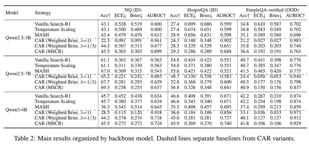 - CAR框架效果显著:相较于基线方法(如温度缩放、MASH等),CAR在保持甚至提升任务准确率的同时,显著降低了ECE和Brier分数,提升了置信度的可靠性。