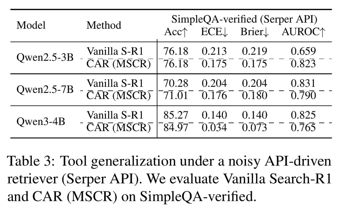 - 泛化能力强:在从本地静态知识库到真实噪声较大的API检索环境的迁移测试中,CAR训练的智能体表现出稳健的校准能力,验证了方法的实用性和适用范围。