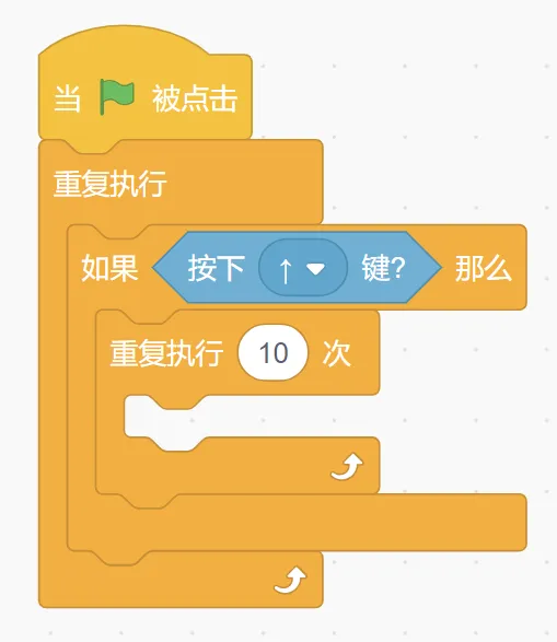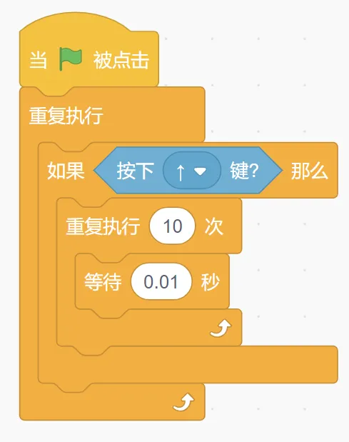 - 将刚才添加的 “重复 10次” 和 “等待0.01秒” 代码块复制一份,并放在“如果 <条件> 那么”块的下面。