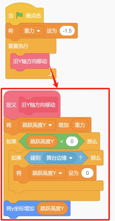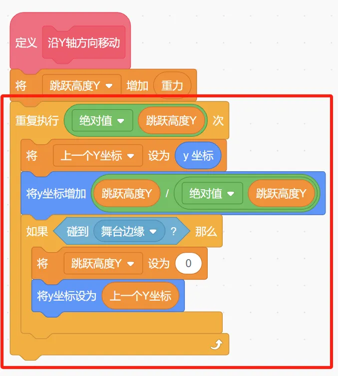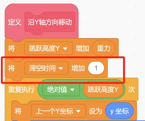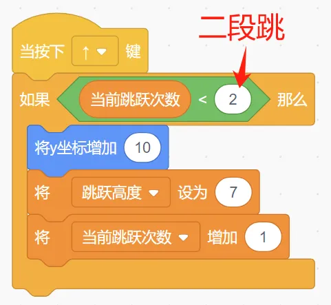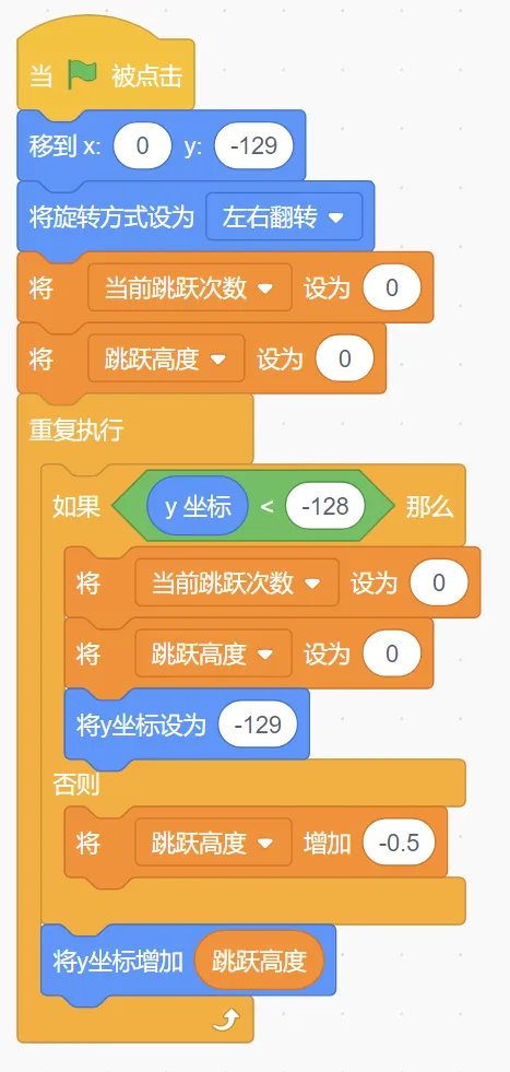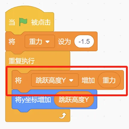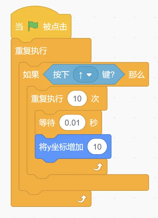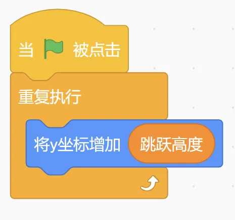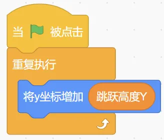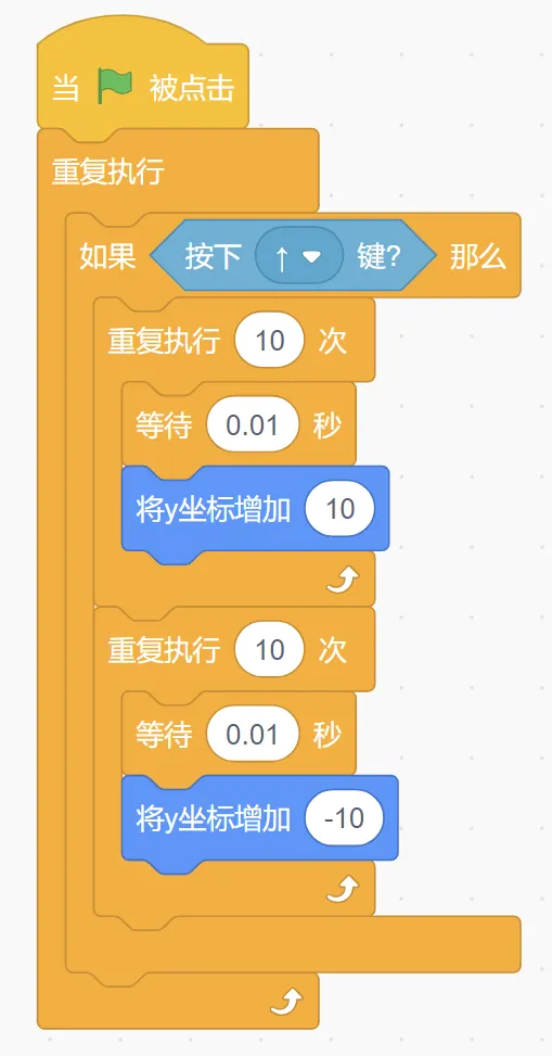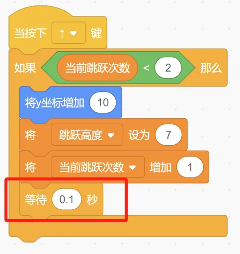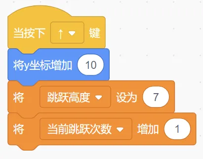 这个代码块会让角色在每次循环时沿 y 轴(垂直方向)上升 10 个单位。改变这个数值可以调整角色跳跃的高度。