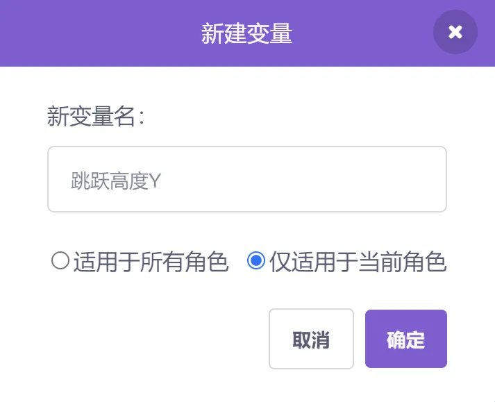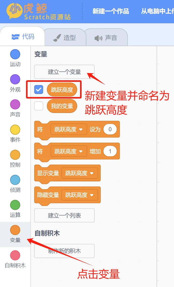 在“变量”选项卡中,创建一个变量并重命名为“跳跃高度”。