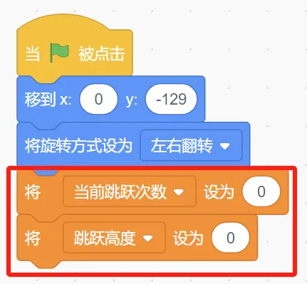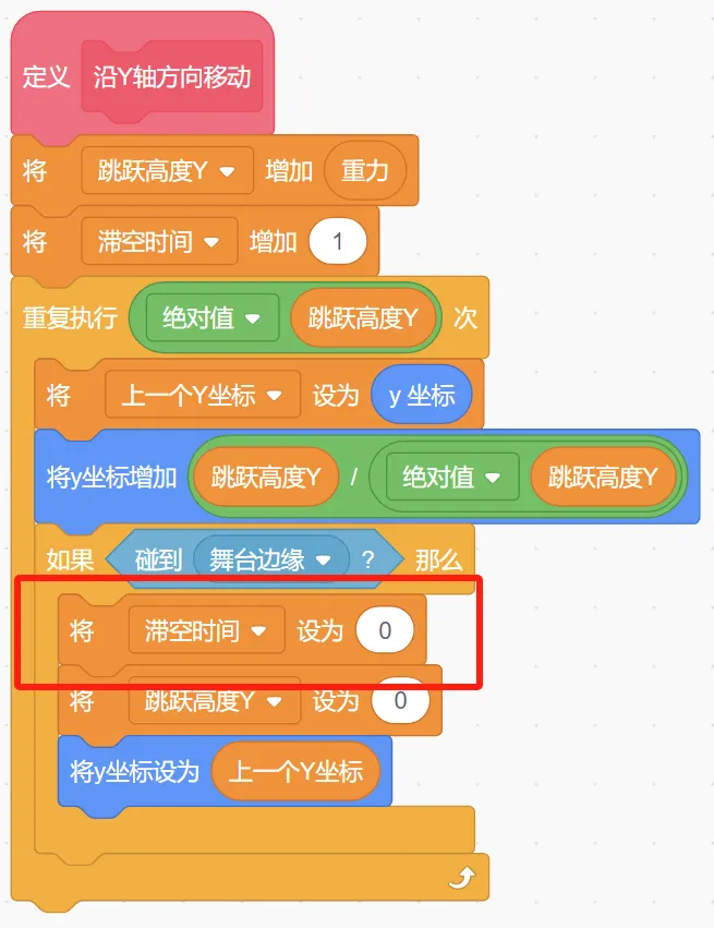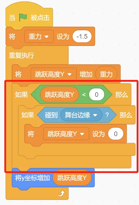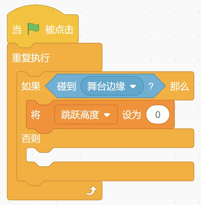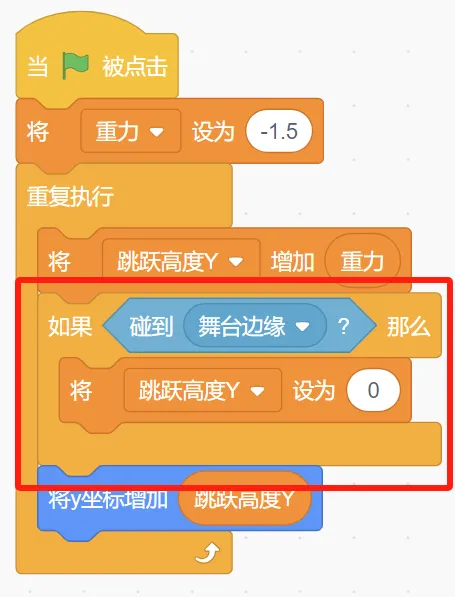 对角色是否碰到舞台边缘做判断,如果碰到舞台边缘,我们将跳跃高度Y设为0。