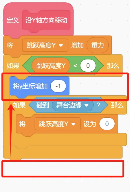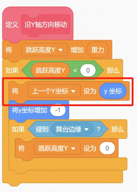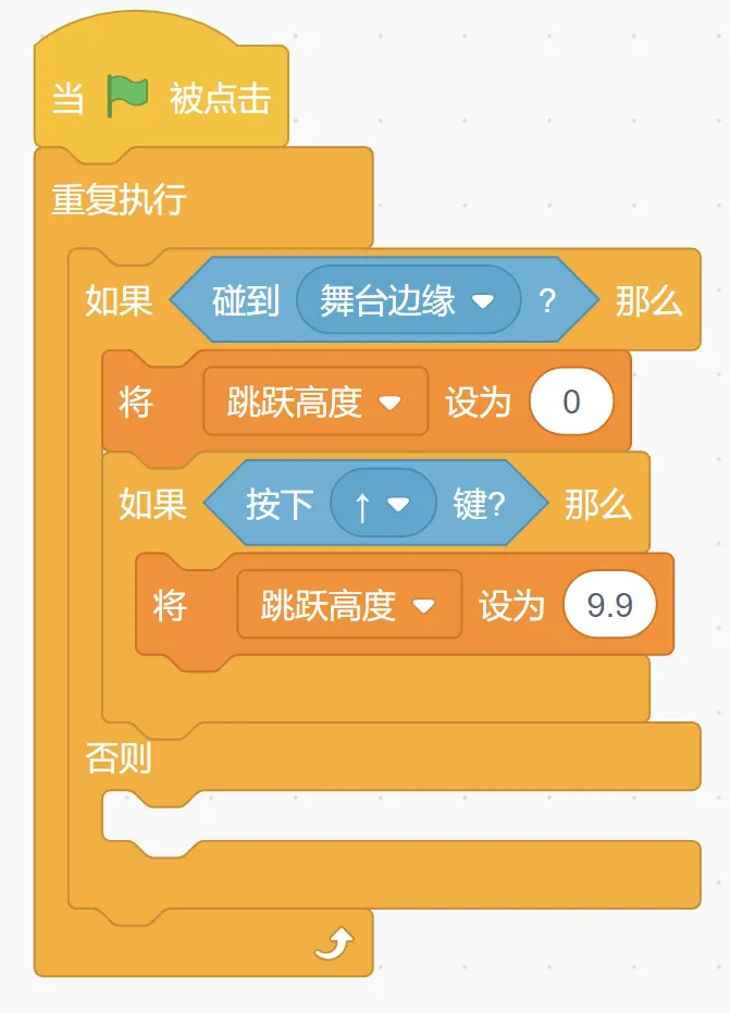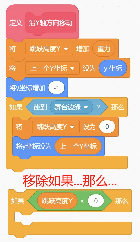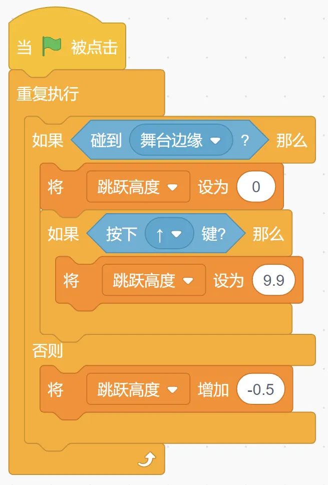 这是因为,由于“如果…那么…”积木块的存在,在变量“跳跃高度Y”变得大于0之前,角色的Y坐标为-1来判断角色是否已经碰到屏幕边缘,所以总是确定角色已经碰到屏幕边缘了,从而无法再次跳跃。