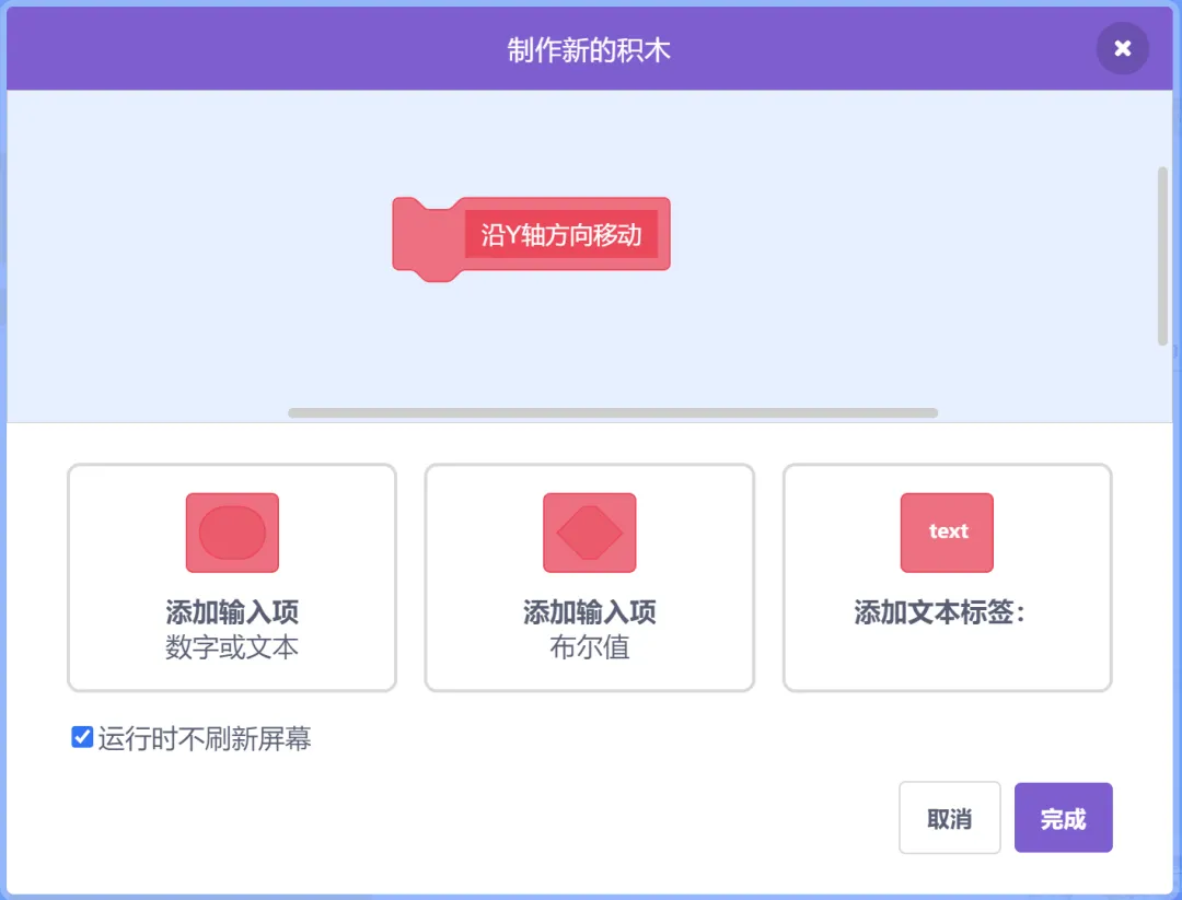 由于循环代码变得有些复杂,现在我们可以将之前的处理逻辑改为自制积木。在创建自制积木时,别忘了勾选“运行时不刷新屏幕”选项。