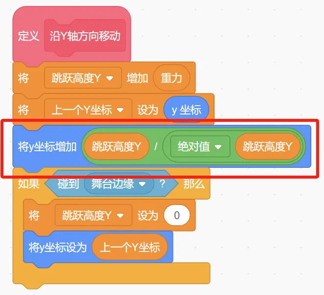 跳跃高度变小的原因是,无论“跳跃高度Y”的值是10还是100,当除以绝对值后,结果都变成了1,所以 Y 坐标只改变了1。