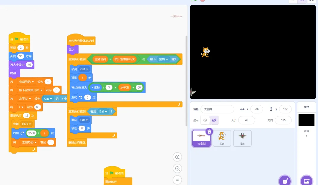 程序控制:按下空格键发射大宝剑,攻击蝙蝠!