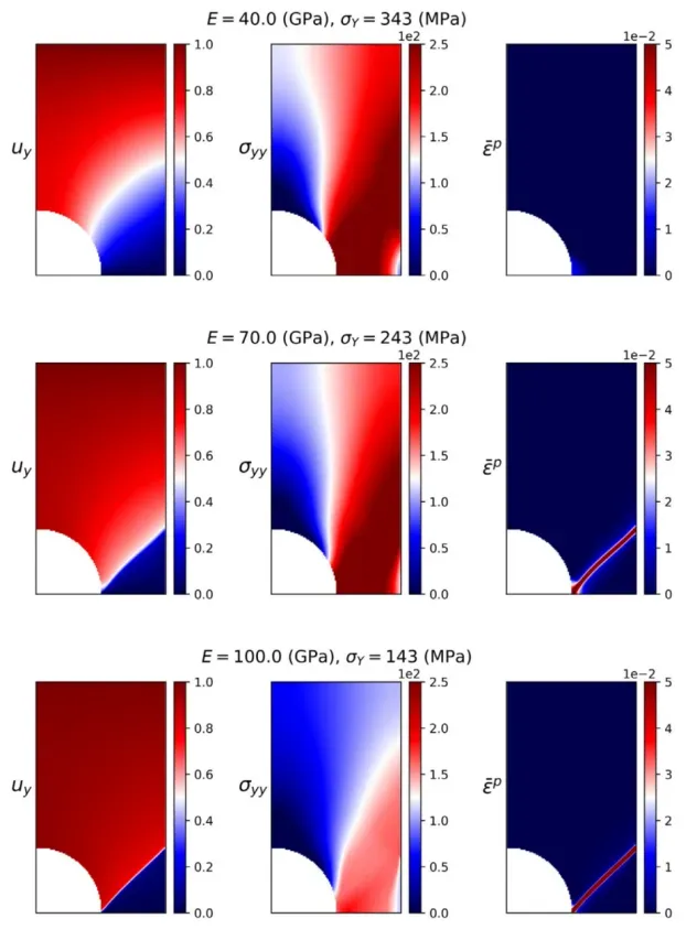 物理知情神经网络(PINN)的引入导致人们对深度神经网络作为固体力学界PDE的通用近似器的兴趣日益浓厚。最近,深能法(DEM)被提出。DEM基于能量最小化原理,与基于PDE残差的PINN相反。DEM的一个显著优点是,与基于强形式残差的公式相比,它需要对低阶导数进行近似。然而,DEM和经典PINN公式都难以解决应力场和位移场的精细特征,例如固体力学应用中的浓度特征。提出了对深能法(DEM)的扩展,以解决有限应变超弹性的这些特征。开发的称为混合深能法(mDEM)的框架引入了应力测量,作为最近引入的纯位移公式的NN的额外输出。使用这种方法,可以更准确地近似Neumann边界条件,并提高通常导致高浓度的空间特征的精度。为了使所提出的方法更加通用,我们引入了一种基于Delaunay积分的数值积分方案,该方案使mDEM框架能够用于具有应力集中的计算域(即具有孔、凹口等的域)通常需要的随机训练点位置集。我们强调了所提出方法的优点,同时展示了经典PINN和DEM公式的缺点。该方法在涉及具有精细几何特征和集中载荷的域的具有挑战性的计算实验的正向计算方面提供了与有限元法(FEM)相当的结果,但还为解决超弹性背景下的逆问题和参数估计提供了独特的能力。